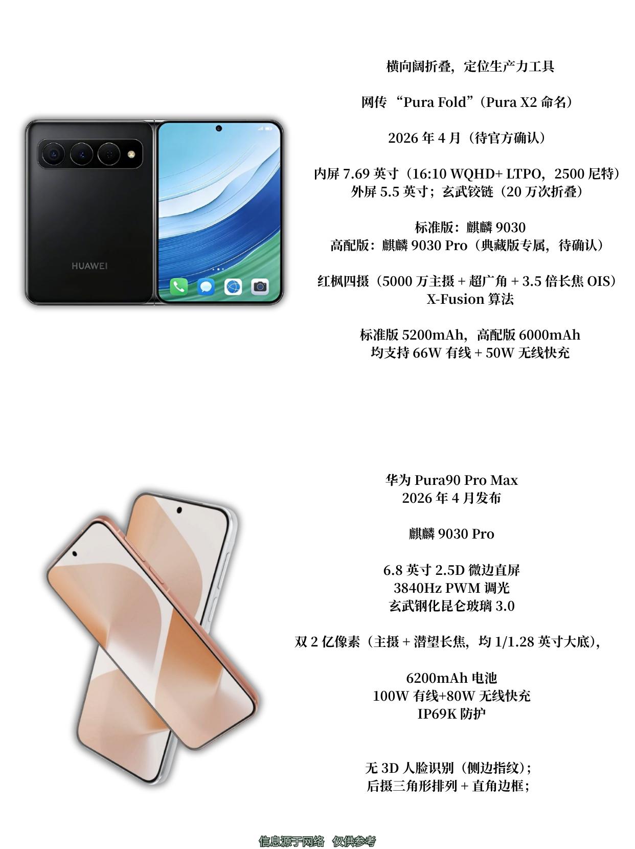 或改名Pura Fold?携手Pura90系列4月发布 现在的爆料也多起来了,Pura 90系列这次阵容变了,取消了Ultra款,改成Pura 90、Pura 90 Pro、Pura 90 Pro Max三款。 最大的升级是那颗2亿像素潜望式超级长焦,配1/1.28英寸超大底传感器。屏幕全系直屏,渐变配色也回归了,当年P20系列极光色那波回忆杀 Pura X2阔折叠这次也升级了,据说可能改名。内屏从上一代的6.3英寸提升到7.69英寸WQHD+,外屏从3.5英寸升级到5.5英寸,合起来单手握持,展开就是小平板,搭载麒麟9030芯片,电池可能给到6000mAh,对比上一代,这次外屏实用性确实提升不少。 一个主打影像极致,一个主打形态创新,华为这波4月双旗舰,你们准备蹲哪台? 一起聊数码 科技资讯早知道 华为Pura90 purax2 阔折叠