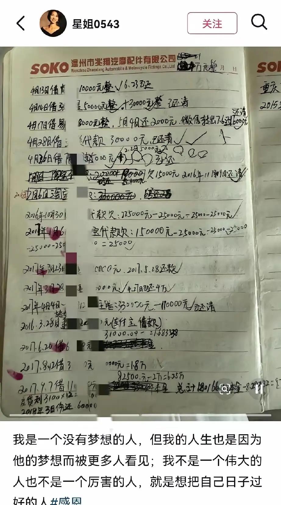 张雪的老婆星姐晒出她记录的欠账。她说直到2024年我们才还完个人欠款。有一个记者追随了张雪20年拍他的纪录片,他说星姐跟我说,在2018年的时候,张雪挣钱回来第一件事,就是买两袋米,只要有米,这个日子就能过下去。没有菜可以吃点咸菜,挖点野菜,到菜场捡点烂菜叶。静姐说,我是一个没有梦想的人 ,我是因为他的梦想才被大家看到。