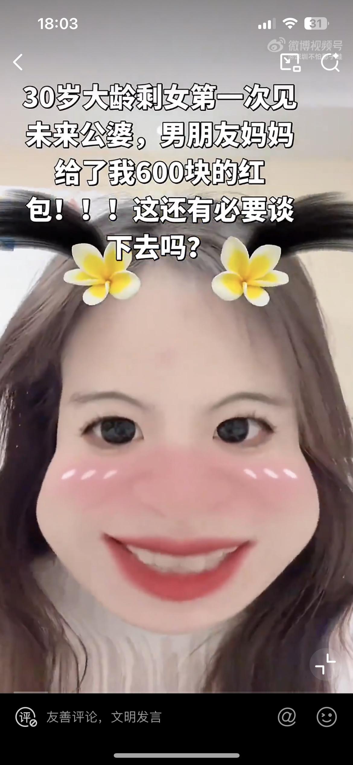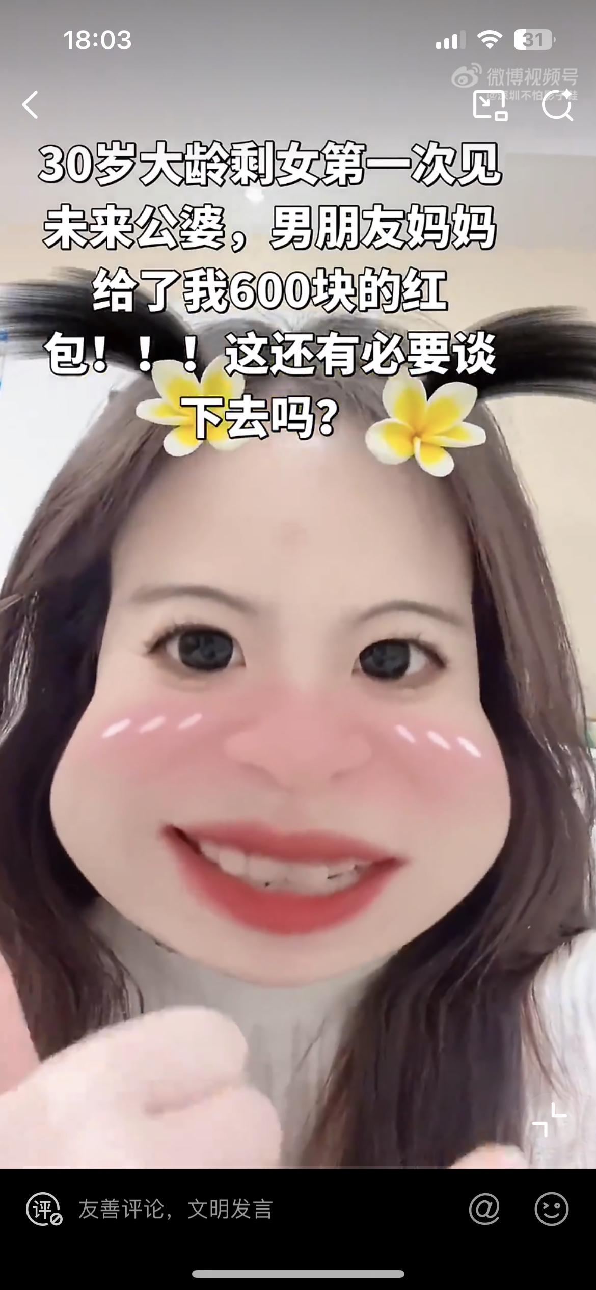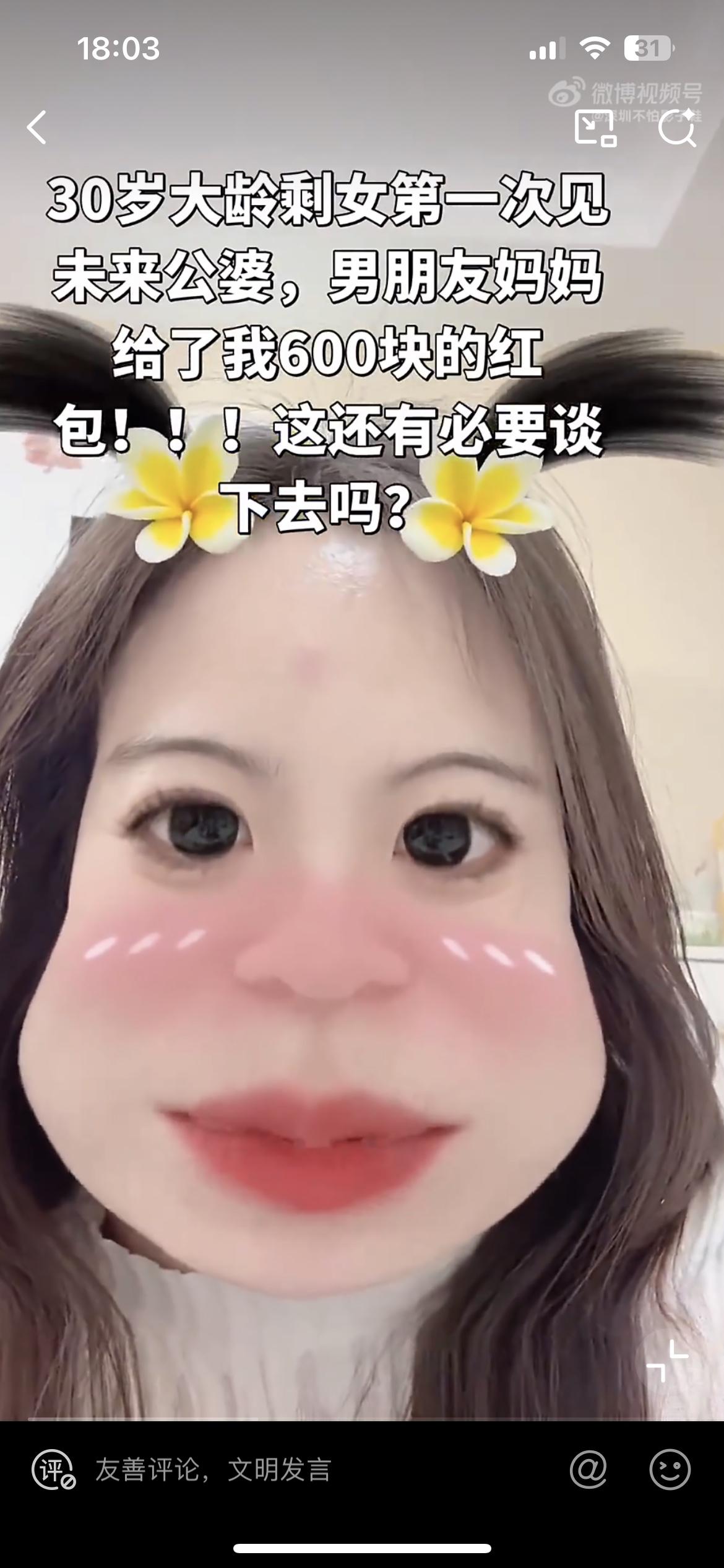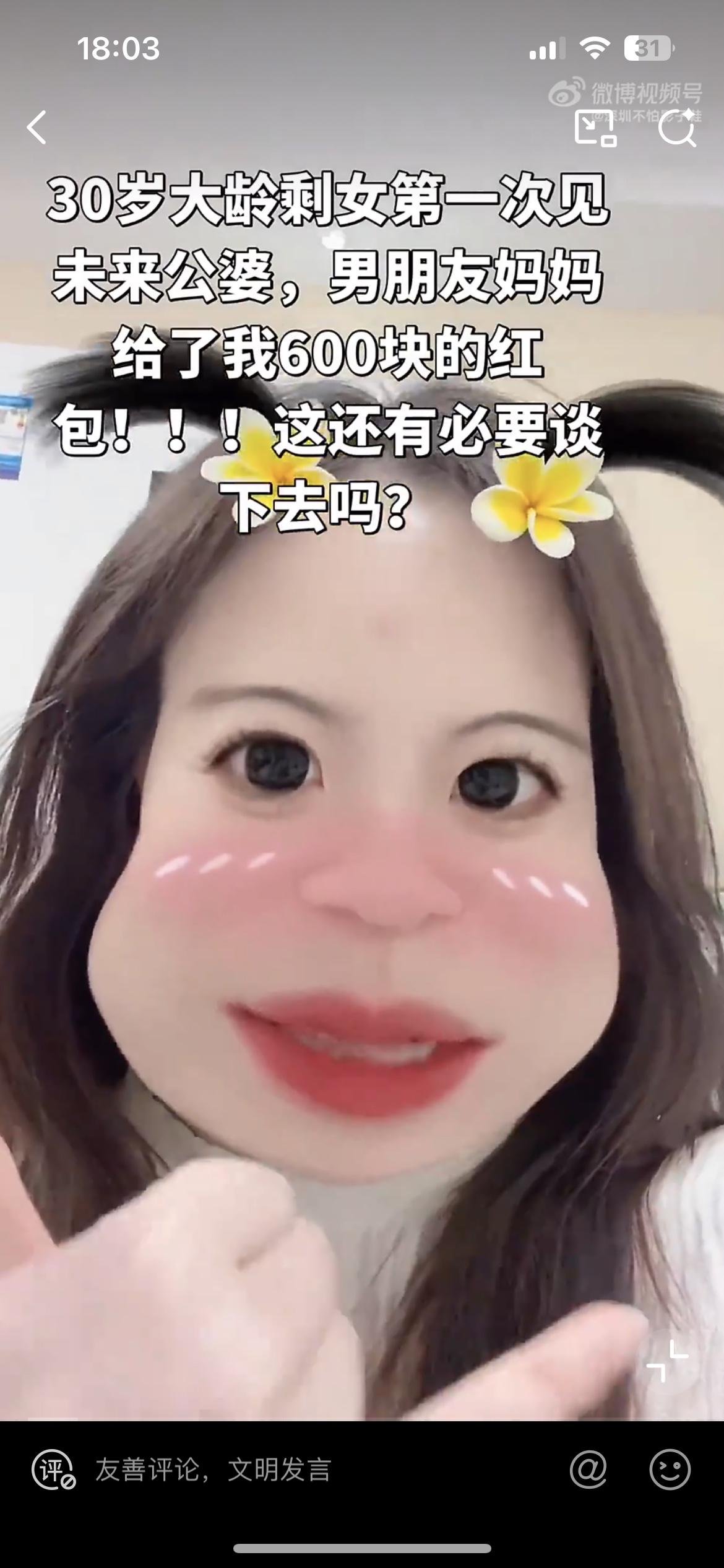 30 岁的小仙女第一次去男朋友家,未来公婆给了她 600 块的红包,小仙女破防了,问网友这个婚还能结吗? 小仙女和现在的男朋友谈了两年,感情挺好,男朋友对她也不错。就提出回去见一下爸妈,小仙女爽快的答应了,在他家吃了个便饭。临走的时候,他爸妈塞了个红包给她。小仙女挺激动,觉得他爸妈对她挺好。当着他们的面,小仙女客气了一下,勉为其难的收下,但心里面暗喜。 回到家后迫不及待的拆开红包,数了一数,才 600 块,小仙女整个气炸了。虽然已经 30 岁了,就只值 600 块吗?作为他们未来的儿媳,如此没有分量?太被看轻了,她都不好意思和闺蜜、父母说。小仙女犹豫了,还要不要和男朋友交往?这个婚能不能结?