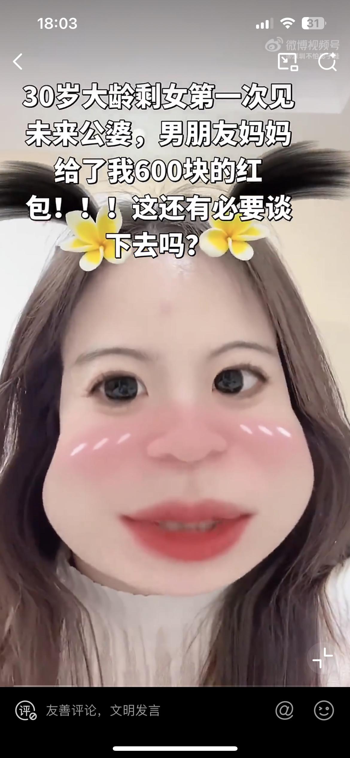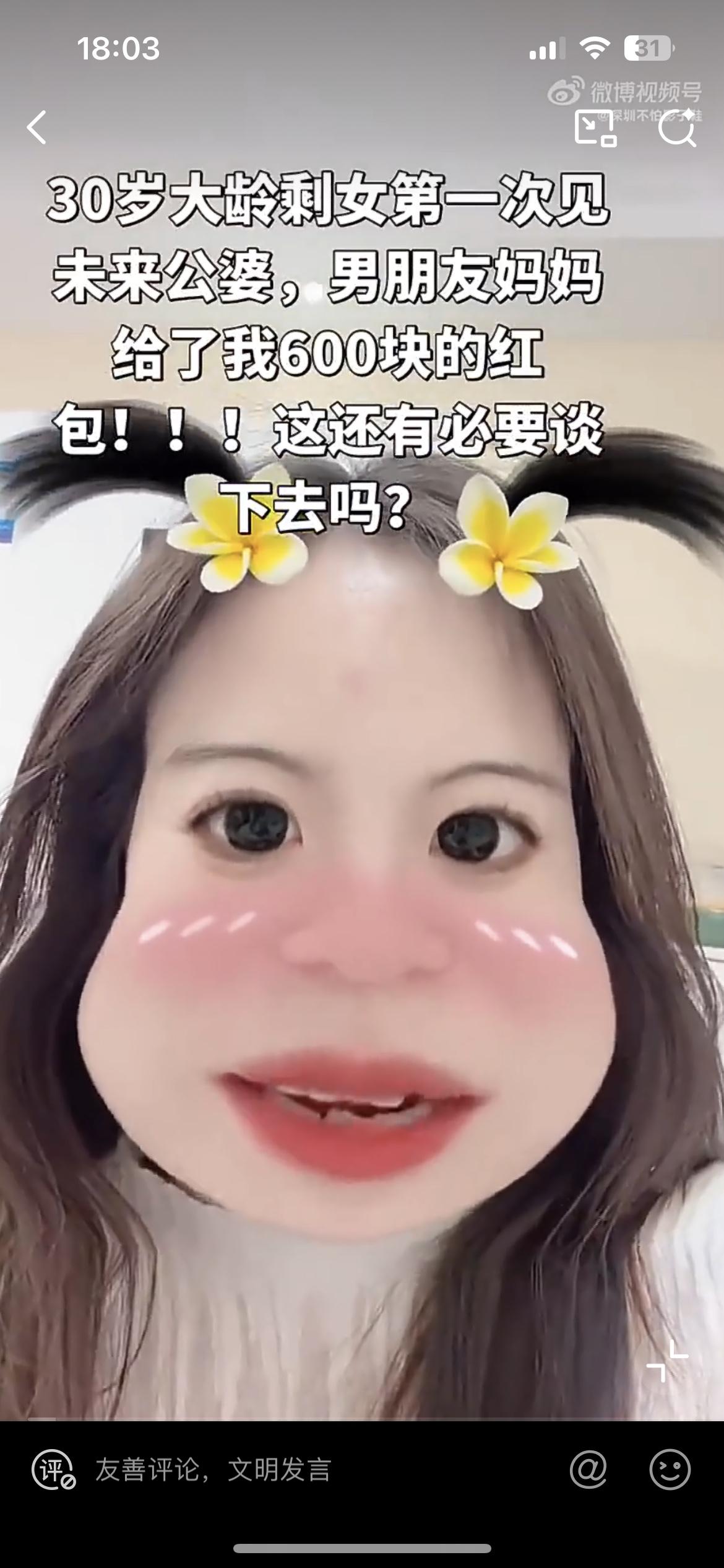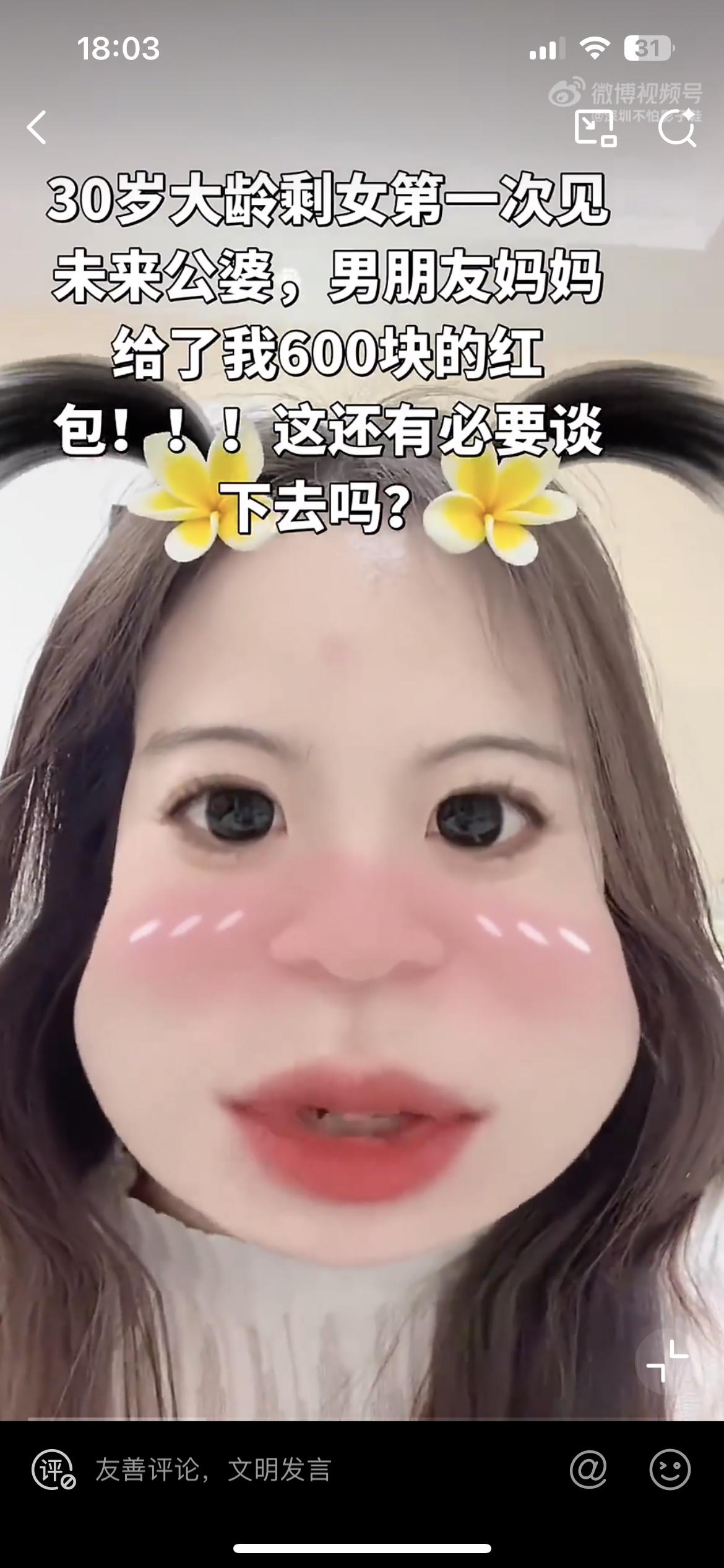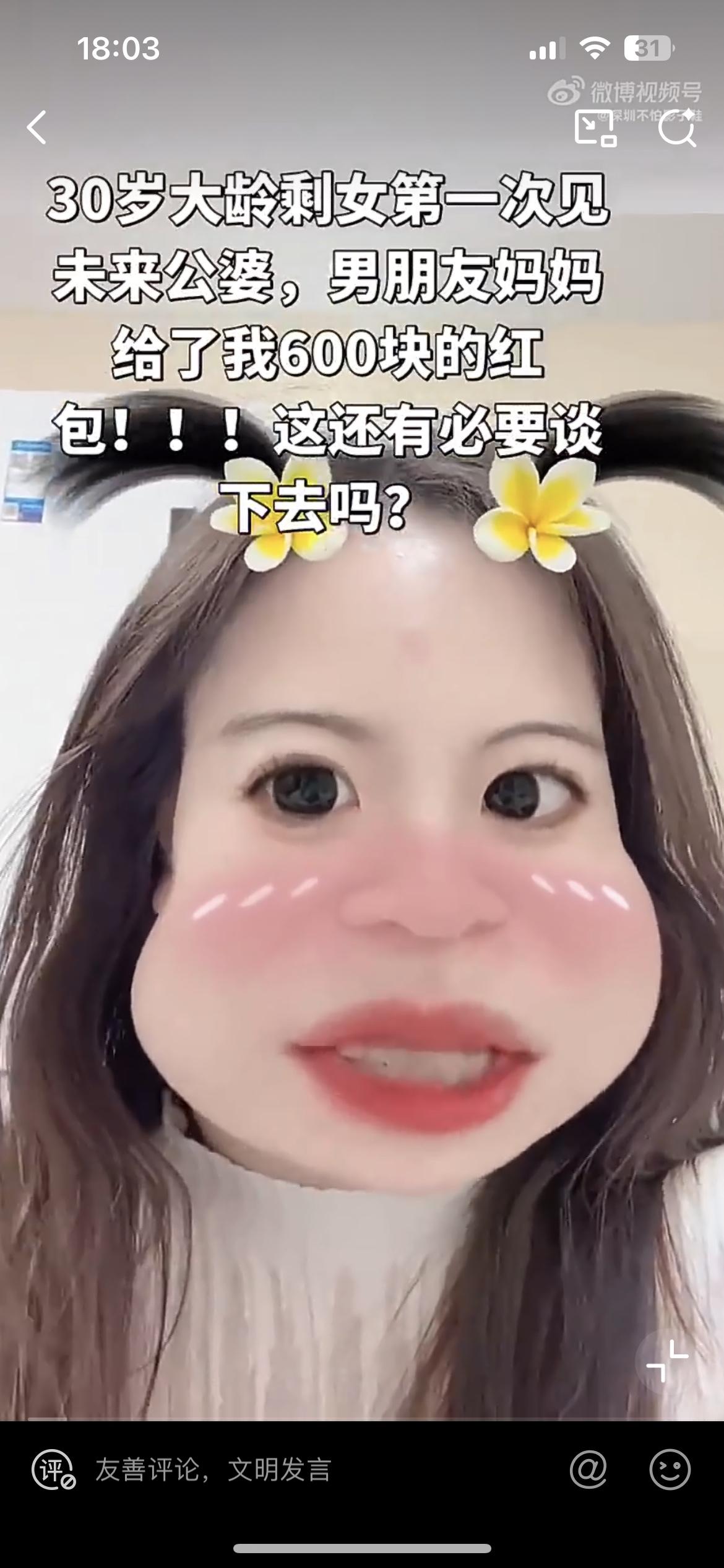 30 岁的小仙女第一次去男朋友家,未来公婆给了她 600 块的红包,小仙女破防了,问网友这个婚还能结吗? 小仙女和现在的男朋友谈了两年,感情挺好,男朋友对她也不错。就提出回去见一下爸妈,小仙女爽快的答应了,在他家吃了个便饭。临走的时候,他爸妈塞了个红包给她。小仙女挺激动,觉得他爸妈对她挺好。当着他们的面,小仙女客气了一下,勉为其难的收下,但心里面暗喜。 回到家后迫不及待的拆开红包,数了一数,才 600 块,小仙女整个气炸了。虽然已经 30 岁了,就只值 600 块吗?作为他们未来的儿媳,如此没有分量?太被看轻了,她都不好意思和闺蜜、父母说。小仙女犹豫了,还要不要和男朋友交往?这个婚能不能结?