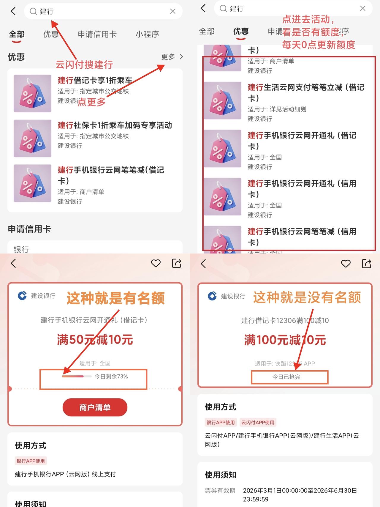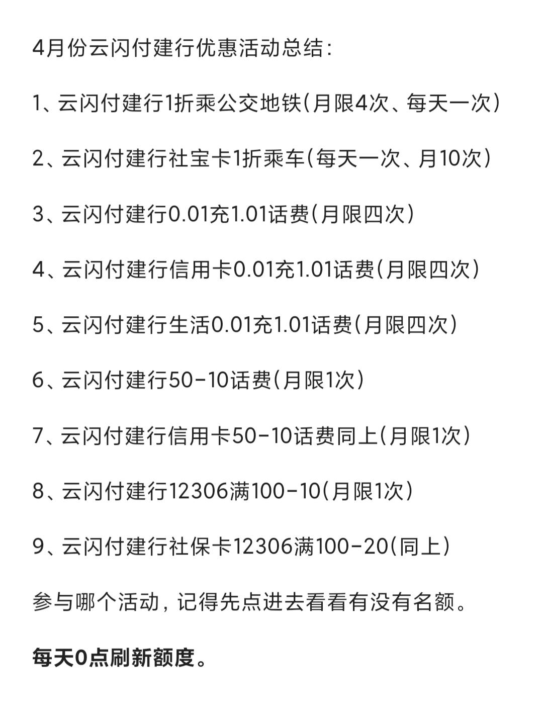 4月份云闪付建行优惠活动总结: 1,云闪付建行1折乘公交地铁(月限4次,每天一次) 2,云闪付建行社宝卡1折乘车(每天一次,月10次) 3,云闪付建行0.01充1.01话费(月限四次) 4,云闪付建行信用卡0.01充1.01话费(月限四次) 5,云闪付建行生活0.01充1.01话费(月限四次) 6,云闪付建行50-10话费(月限1次) 7,云闪付建行信用卡50-10话费同上(月限1次) 8,云闪付建行12306满100-10(月限1次) 9,云闪付建行社保卡12306满100-20(同上) 参与哪个活动,记得先点进去看看有没有名额。 每天0点刷新额度。免费薅羊毛 建行省钱攻略 省钱薅羊毛平台