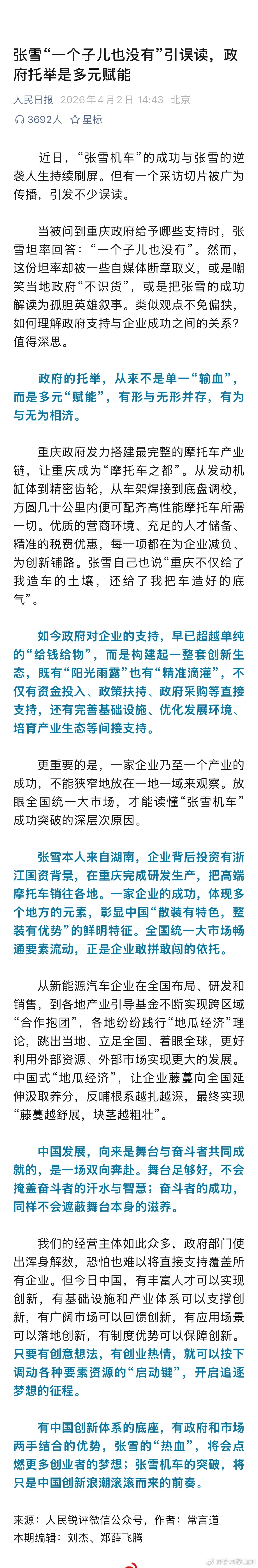 重庆这次真挺冤的。记者应该换个问法:“你为什么选择到重庆造摩托车。”角度一变天地宽。张雪