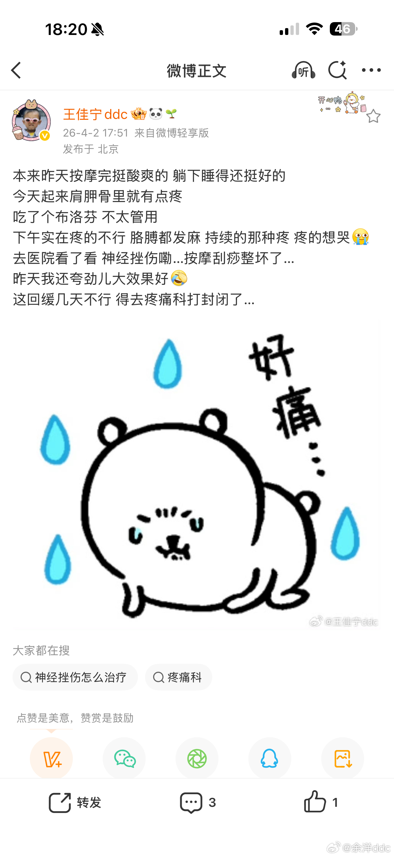 笑死我了,王老师今天看着特别萎靡,给我说他肩胛骨缝里有点痛,我用所学的运动生理学,运动解剖学,运动心里学给小王吧一顿分析,他的疼痛不像是运动导致,完全静止也痛得忍不住,也找不到缓解的姿势,关节也不受限,感觉这事没这么简单,送王老师去医院的路上,我给他分析了可能是胸椎间盘突出压迫神经导致辐射痛,心绞痛…,吓得不轻…最后原来是被大力按摩所致