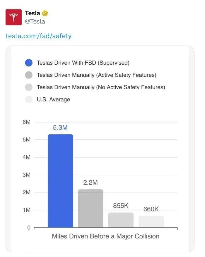 在智能辅助驾驶开启状态下,特斯拉的行车安全水平达到美国道路平均水平的8倍以上。