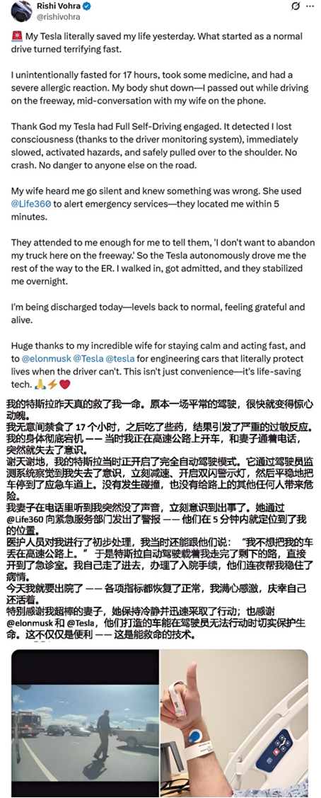 特斯拉车主“RishiVohra”就曾分享过一段亲身经历:他在高速行驶时突发严重过敏,一度失去意识。