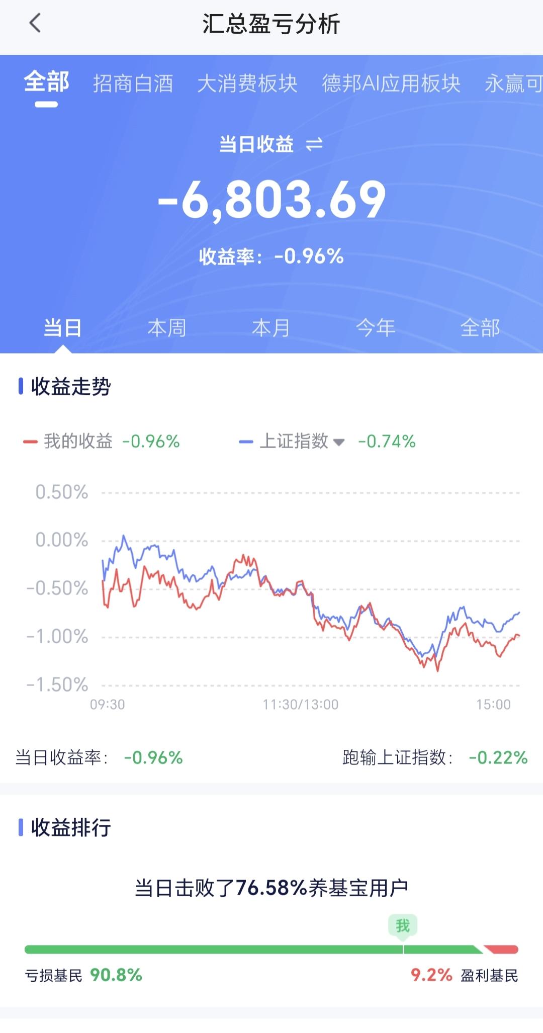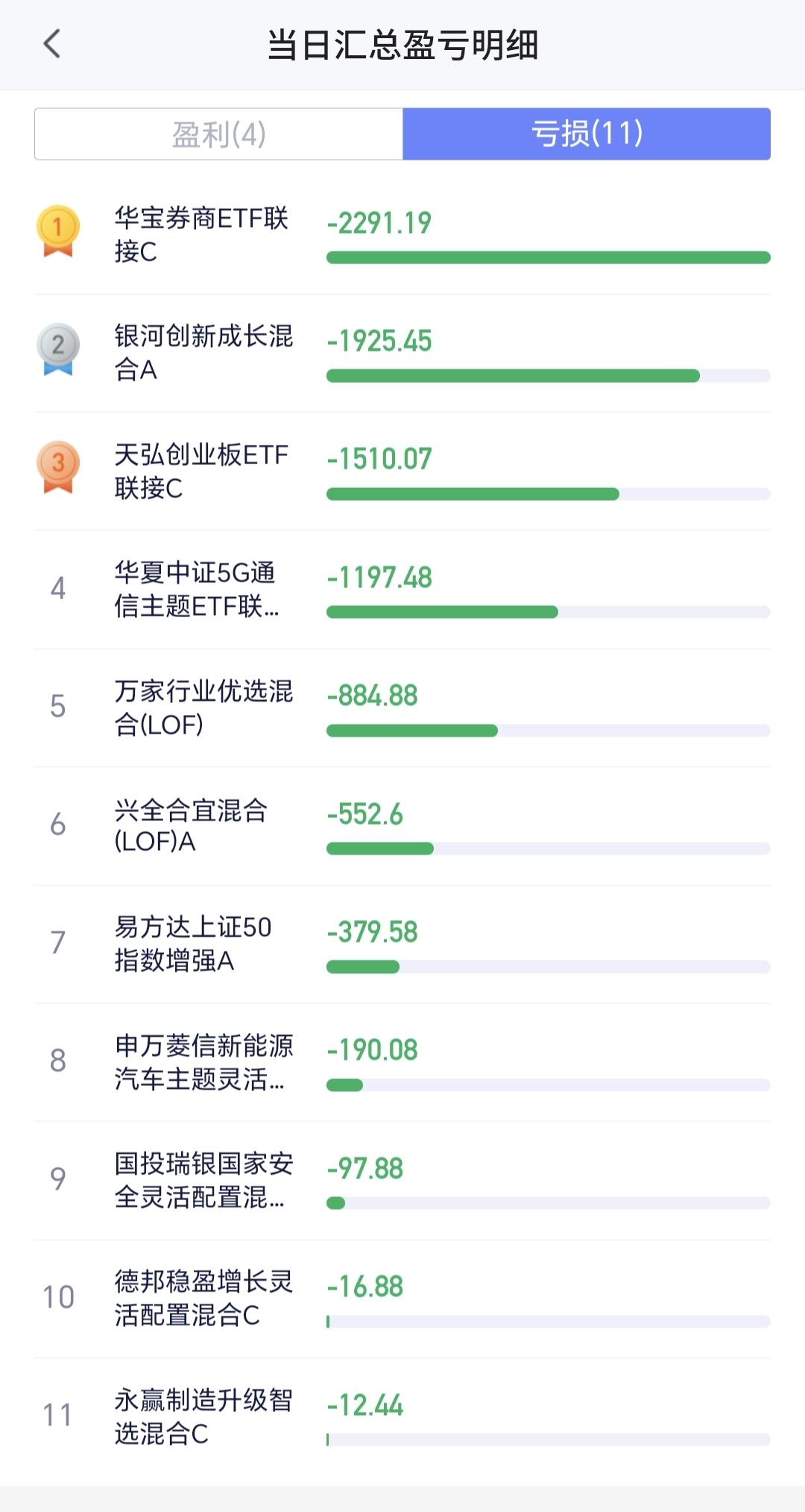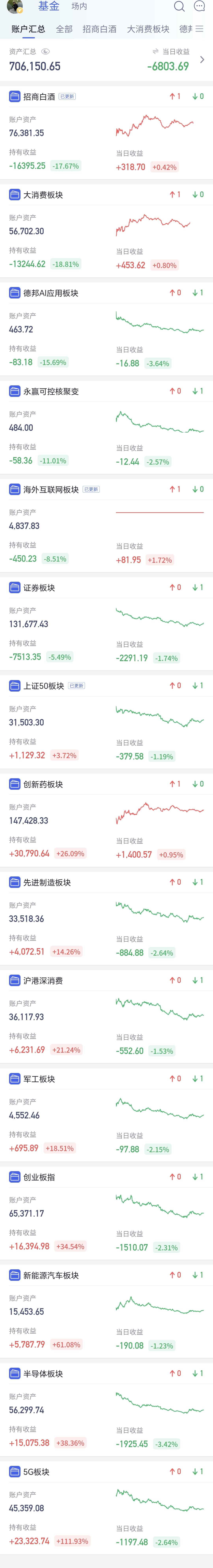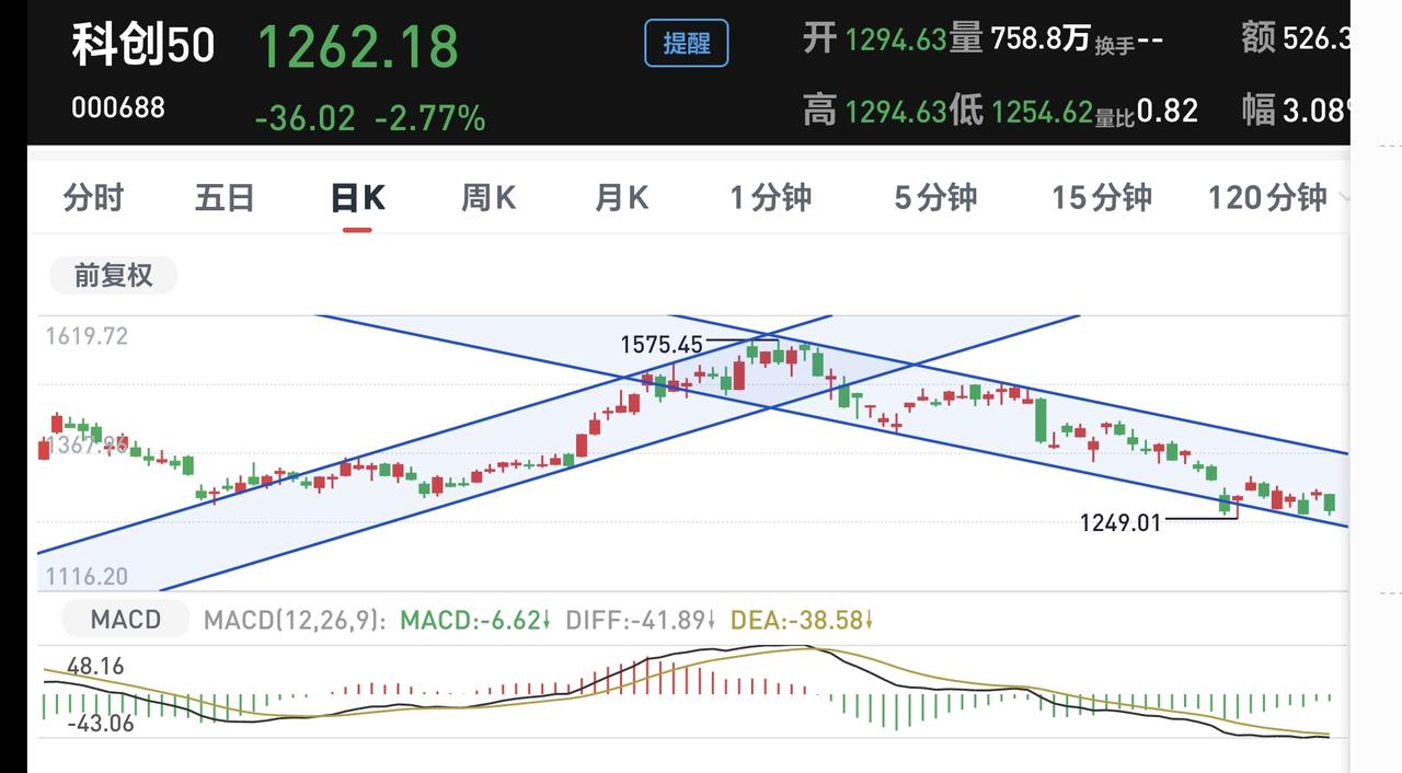基金:不要等待了,可以陆续进场了,机会不是等来的,而是先下手为强争取的。 这是一位朋友的留言,谢谢这位朋友。 我认为: 1:市场上是存在机会的,市场高位区域的时候,是落袋为安的机会,市场低位区域的时候,是抄底进场的机会。 2:市场机会来了的时候,最关键的是你有没有抓住机会的资本,高位区域可以落袋为安的时候,就看你手中有没有足够多的筹码,低位区域可以抄底进场的时候,就看你手中有没有足够多的现金。 3:市场的机会并不是每天都有的,我们玩基金并不是玩股票,即使是玩股票也不会每天都操作,玩基金每年只要操作个几次就可以了,玩基金做的是波段,而且是相对大一点的波段,小波段并不是机会,中大波段才是机会。 4:市场的机会是等待来的,并不是争取来的,市场的上涨和下跌,我们自己决定不了,市场的高位区域和低位区域,是市场运行到一定的阶段才会形成的,我们只有等待高位区域和低位区域的到来,我们并不能主动的让市场到达高位区域或者是低位区域。 5:现阶段的市场是不是有机会,这需要看每个板块的情况,有的板块处于高位区域,有的板块处于低位区域,处于高位区域的板块就是落袋为安的机会,处于低位区域的板块就是抄底进场的机会,当大部分板块处于高位区域的时候,市场整体大概率处于高位区域。当大部分板块处于低位区域的时候,市场整体大概率处于低位区域。 6:市场从去年3040点上涨到今年最高4197点以来,过程当中并没有一个像样的调整,这一次的调整幅度是最大的,调整到了3794点,调整的点位空间400个点左右,到现在为止,还不能判断3794点就是这一轮调整的最低点,当然,也有3794点就是这轮调整最低点的可能性,究竟是不是这轮调整的最低点,还需要继续观察。 7:如果3794点就是这轮调整的最低点,3850点附近就可以考虑进场,就是抄底进场的机会,如果3794点并不是这轮调整的最低点,我们需要观察后面这段时间下跌的速度,如果速度不快,3800点附近就可以考虑抄底进场。 8:玩基金并不是随意操作的,我们以科创50板块为例来看一下,看下面的截图2,这是科创50板块日K线图,从这个图中我们来找一下理想的进场点和离场点。 ①:理想的进场点是在上涨通道中,是第一次下跌到上涨通道下轨线的那里,上涨通道下轨线附近大概率会上涨,虽然这里不是最低点,但这里进场的确定性相对高一些。 ②:理想的离场点也是在上涨通道中,是第一次下跌跌破上涨通道下轨线的那里,虽然这里不是最高点,但这里离场的确定性相对高一些。 ③:从进场点进场以后,只要保持在这个上涨通道中,只要不跌破这个上涨通道的下轨线,就可以继续持有,因为,你不知道它会上涨到哪里,同样的道理,现在是处于下跌通道中,只要不上涨突破这个下跌通道的上轨线,就不要考虑进场,因为,你不知道在这个下跌通道内会下跌到哪里。 ④:从这个科创50的例子可以知道,上涨并不是进场的理由,下跌也不是离场的理由,上涨和下跌都不是进场和离场的理由,只有改变上涨趋势和下跌趋势的涨跌,才是进场和离场的理由。第一次跌破上涨通道下轨线的,那一次下跌才是改变这个板块日线级别上涨趋势的下跌,这个下跌改变了上涨趋势才是离场的理由。 今天收盘的时候,持有的基金大部分都是亏损,亏损金额最大的三个板块是:证券板块,芯片半导体板块,创业板指,盈利金额最大的三个板块是:创新药板块,大消费板块,白酒板块,估值整体亏损了6803元,持有各只基金的情况见下面的截图6。 最近一个阶段,我们只要观察两个点位就可以了,一个是3955点,观察盘中能不能上涨突破3955点,如果上涨突破3955点,现阶段就有可能不是五浪下跌走势,另一个是3852点观察盘中会不会下跌,跌破3852点,如果下跌跌破3852点,现阶段就有可能是五浪下跌走势。 如果你感觉这篇文章对你有所收获,你就评论点赞,转发和分享一下,点赞和评论是对我最大的支持,不劳而获的人都是在耍流氓。