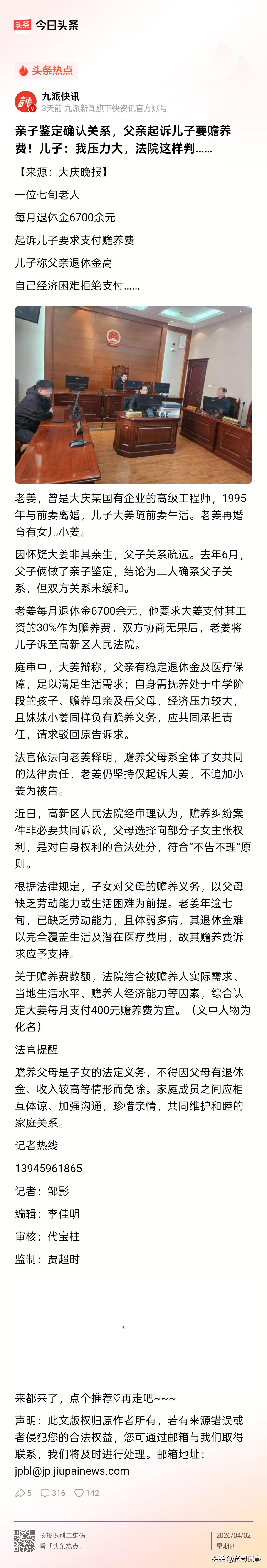 金钱再次战胜了亲情!黑龙江大庆,一老人因怀疑儿子不是亲生的,遂拉着儿子做亲子鉴定确认关系。之后,每月有6700元退休金的他,在儿子有家庭且压力较大的情况下,又要求儿子每月拿出30%工资作为赡养费给他。在协商未果后,老人果断将儿子告上了法院。 据九派快讯报道,老姜原是大庆某国有企业高级工程师,1995年与前妻离婚,儿子姜先生便跟随前妻一起生活,之后他再婚,生下女儿小姜。 多年来,老姜一直怀疑姜姜先生并非自己亲生,因此父子俩的关系十分疏远。 2026年6月份,老姜和姜先生做了亲子鉴定,结果确认二人就是实实在在的亲子关系。 可即便如此,两人依旧隔阂很深。 老姜在从单位退休后每月有6700余元退休金。 但他仍觉得这不够用,要求姜先生每月支付工资的30%作为赡养费。 姜先生自然无法接受,双方多次协商未果后,一怒之下,老姜直接将姜先生起诉到了当地法院。 庭审中,姜先生当庭说出了自己的苦衷:父亲每月有6700多元的退休金,还有完善的医疗保障,这笔收入完全能满足他的基本生活需求; 而自己眼下生活压力不小,孩子正处于中学阶段,日常抚养、教育开支不小,同时还要赡养自己的母亲以及岳父母,家庭经济负担很重。 另外,姜先生还认为妹妹小姜作为父亲的亲生女儿,同样负有赡养老人的法定义务,这笔赡养费不该由他一人承担,因此请求法院驳回父亲的诉求。 法院还告知老姜,赡养老人是所有子女的共同责任,女儿小姜也需履行义务,建议追加小姜为被告,但老姜坚持只起诉姜先生,不肯追加女儿。 此事也引起了网友的热议: 有网友觉得:“父亲有退休金还告儿子,确实有点不近人情,儿子要养一大家子,压力摆在那,父亲只盯着儿子,不找女儿,太偏心了。” 也有网友认为,虽然老人的退休金很高,但万一老人要看病吃药,这些钱的确覆盖不到,儿子多少也得给些。 还有网友表示:“清官难断家务事!这姜老汉只盯着那点赡养费,把儿子告上法院,即便最后赢了又如何,亲情早就输光了!” 1、老姜坚持向儿子姜先生索要赡养费,合乎法律,但从情理来看,对儿子的确不公平。 民事诉讼遵循“不告不理”原则!老姜有权只告部分子女,法院也尊重其权利处分。 但厚此薄彼、一碗水端不平的做法,也的确会让姜先生寒心。 2、姜先生有义务赡养老姜。 《民法典》第26条第2款规定,成年子女对父母负有赡养、扶助和保护的义务。 《民法典》第1067条第2款:成年子女不履行赡养义务的,缺乏劳动能力或者生活困难的父母,有要求成年子女给付赡养费的权利。 赡养老人是法定义务,无法免除。 本案中,老姜年事已高,丧失劳动能力。 虽有6700元退休金,但经查证其体弱多病、医疗开支大,退休金不足以覆盖全部生活及医疗需求,属于上述条款中“生活困难”的情况。 老姜当然有权让姜先生给付赡养费。 3、具体给付赡养费的数额,并不是老姜要多少就给多少。 《老年人权益保障法》第十九条规定,赡养费的给付标准,应当根据老年人的实际需要、赡养人的经济能力和当地的实际生活水平确定。 简单来说,老姜的退休金足以涵盖其大部分支出,而姜先生收入有限,生活、赡养压力都很大。 再结合当地的生活水平,法院最终判决由姜先生向老姜每月支付400元赡养费为宜。 总的来说,为人父母,养育子女是本心;为人子女,孝顺父母是本分。 可偏心的则会让父子亲情的天平失衡,这场官司即便赢了法理,却输了人心。 这也给所有家庭提了醒:儿女的赡养义务法定平等,父母的对待更该一碗水端平。 否则,再亲的血缘,到头来也只会耗尽子女仅剩的情分,彻底丢掉最珍贵的亲情,得不偿失。 对此,你怎么看呢?欢迎大家在评论区留言。