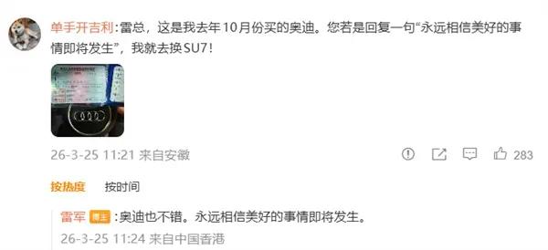 雷军一句话,奥迪几乎要跪着卖车了。没想到网友隔空同雷军打赌互动,竟然引发了一出好戏。这个网友本来是个奥迪车主,前几天喊话雷军,要是回复他一句“永远相信美好的事情即将发生,他就去换SU7”。网友可能一开始就当一个玩笑,人家身价千亿的老板怎么会随意应承个人,还刚好能看到网友的声音。 令所有人意外的是,就过了3分钟,雷军真就亲自下场回复了这个网友,称奥迪也不错,永远相信美好的事情即将发生。雷军的回复堪称典范,既保全了奥迪的面子,又给小米拉来一个潜在客户。球回到奥迪车主脚下后,瞬间引爆吃瓜群众,大家都等着看这个奥迪车主究竟只是逞口舌之利,还是会来真的。 又是一个惊人的反转,奥迪车主两天后晒出了小米SU7的订单截图,并喊话雷军作业已交。这下子轮到奥迪难过了,这家向来高傲的德系豪车,这次居然放低身段试图挽回失去的客户。上汽奥迪称赞网友说到做到,欢迎随时回来找脚感,另外奥迪即将上市的新车准备向各大性能SUV发起挑战,看硬核实力能否让这位车主回心转意。 很难相信这是奥迪能公开说出来的话,如此接地气的态度,简直跟之前给大家的印象截然不同。奥迪如此屈尊,绝不仅仅是为这一个车主,他们很清楚,有第一个就有更多个车主转投小米或是其他国产门下。奥迪想要挽回的或者说阻止的,是有更多中产弃他们而去,这个势头已经非常明显。 连续三年在华销量下滑,早已让奥迪感到深深的寒意,去年多次下调车型售价,几万几万的让利,全年一算账,还少赚了11.6亿,相较2022年已经腰斩,奥迪何曾受过这样的屈辱? 说到底,关键还是德系的通病害了他们,包括宝马、奔驰在内,全都低估了汽车电动化浪潮的产业趋势,躺在积攒百年的油车功劳簿上不思进取,以为稍微降个价,国人就会屁颠屁颠排队送钱。直到这些豪华车企们近乎打骨折的降价卖车,却照样没有多少人买账,越来越多人宁可买价格更贵的国产电车,也不考虑BBA,他们才真正体会到了恐怖的滋味。可惜一切都太晚了,BBA的电车,如今在多数国人眼里就是杂牌的代表,如果这个刻板印象不改观,不管降不降价,国人离开的心都很难挽回。