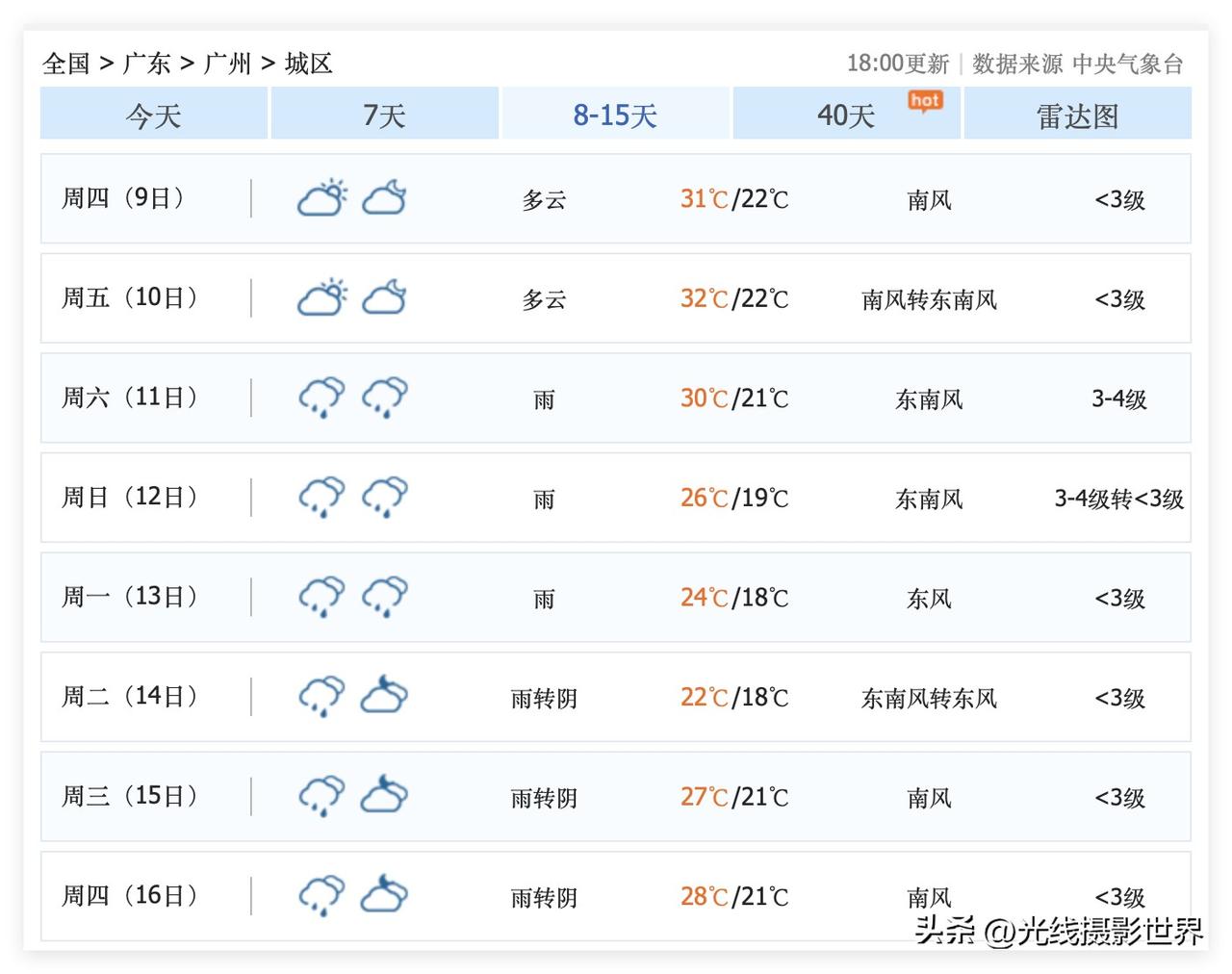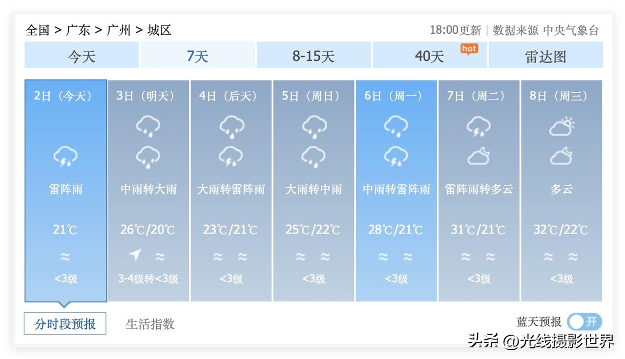 哎!没有办法啊!4月3日到7日,春假,清明节,广东省广州市,真的要泡在雨水里面了!尤其是4月3日到5日,广州市每天都有大雨……广东省,福建省……湖南省,江西省……最近几天,雨水有点多,雨水有点大呀! 虽然高速公路免费,但是,广东省通往湖南省的高速公路网……可能会遭遇下雨天啊! 看来,4月2日晚上到4日晚上,不太方便自驾车跨省出行,广东到湖南,湖南到广东、江西、福建……可能都不太适合长途自驾车……下雨天,局部大雨,暴雨甚至大暴雨……天气不可控……风险较高呀! 中央气象台最新广州天气预报来啦! 4月3日,广州中雨转大雨。 4月4日,广州大雨转雷阵雨。 4月5日,广州大雨转中雨。 …… 好消息是,4月8日到10日,珠三角,广州,深圳,可能会持续放晴,到时候,大家一定要洗洗晒晒啊!