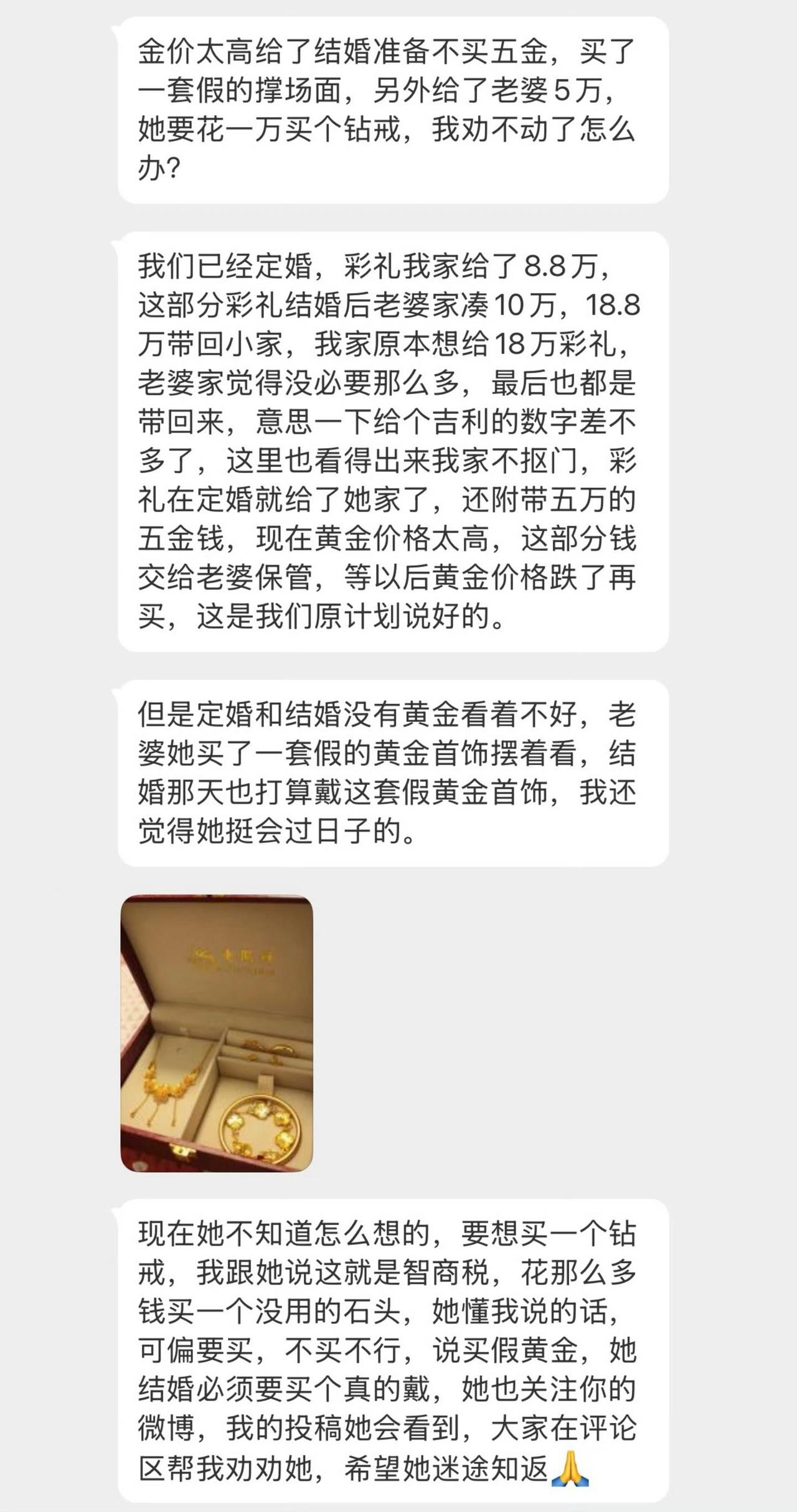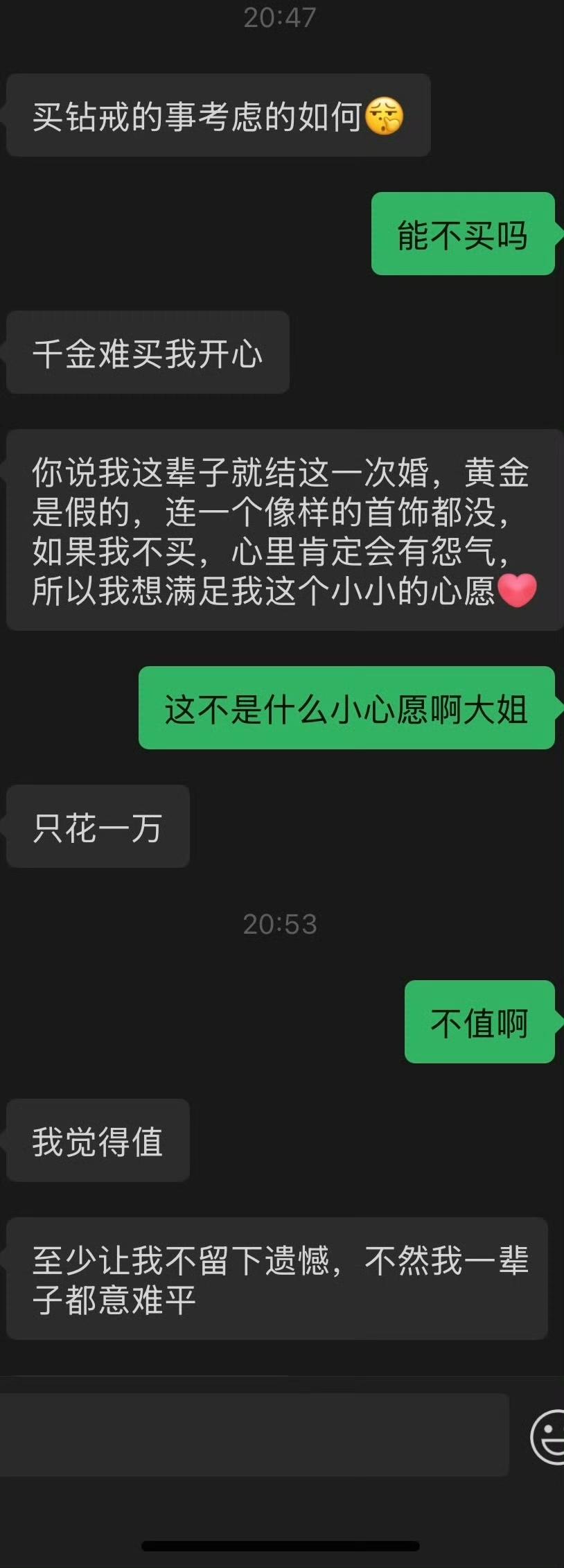 给了结婚对象 8.8 万的彩礼,他们家凑了 10 万,共 18.8 万作为小家的幸福基金。现在对象不知道抽什么风,非得买一枚一万多的钻戒,说是有纪念意义,老公坚决不同意,认为是智商税。 除了彩礼,另外给了 对象5 万去买三金,因为现在黄金首饰价格高,就和对象商量一下,等黄金价格跌了再去买。为了结婚好看,对象就买了一套假的,充一下门面。现在结婚对象僵在买钻石戒指上,老公打死不同意,你们觉得这个结婚对象的要求合理吗?还是老公的反对更理性?