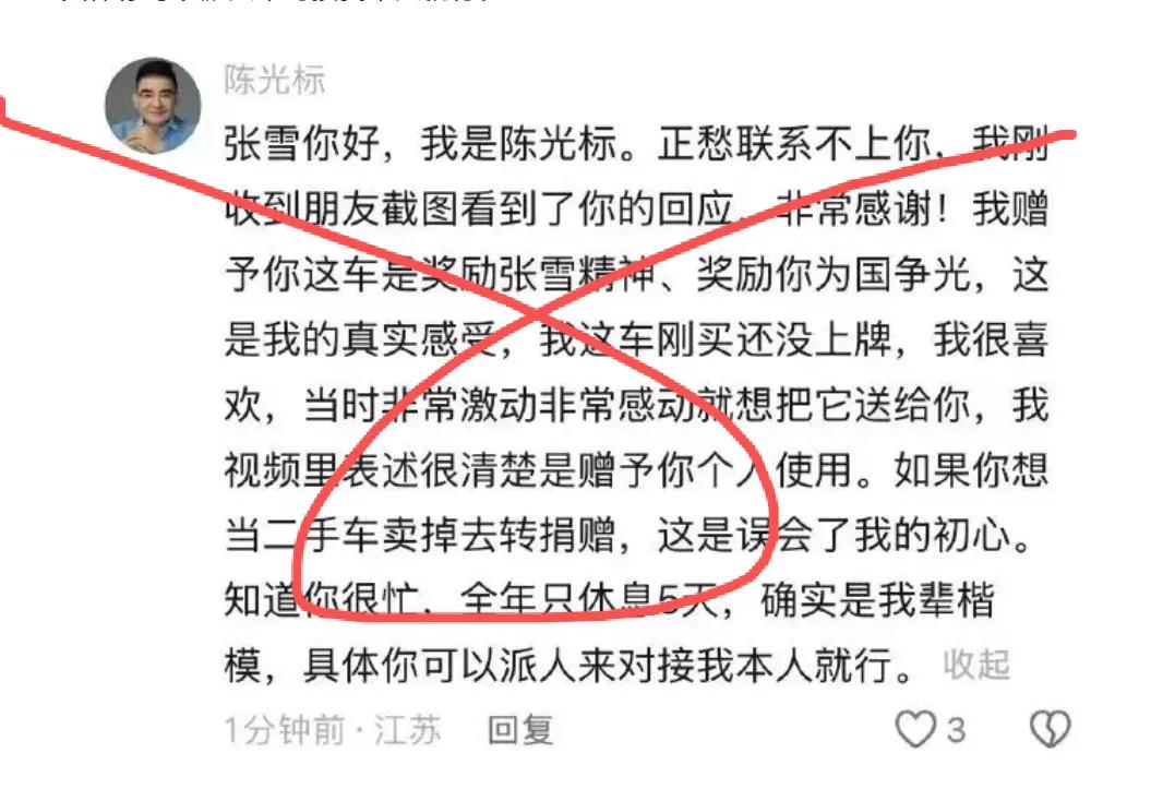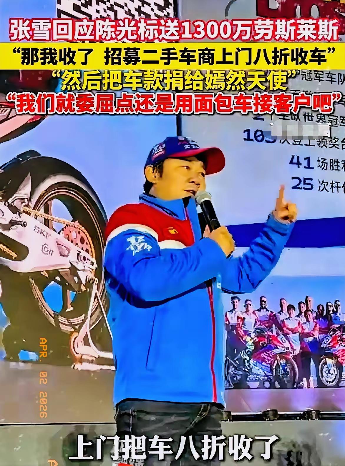 【玩砸了?】 陈光标一激动说:我的新车劳斯莱斯加长版,国内唯一一辆,我要送给你张雪。 张雪回复: 你要给我,那我八折卖了捐赠给嫣然基金 最后还补一句:你还送我吗? 陈总脸上挂不住了 说“误会了我的初心” 我只是送给你本人,而不是……。 看来有些后悔?还是感觉被戏耍?