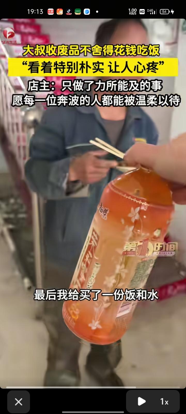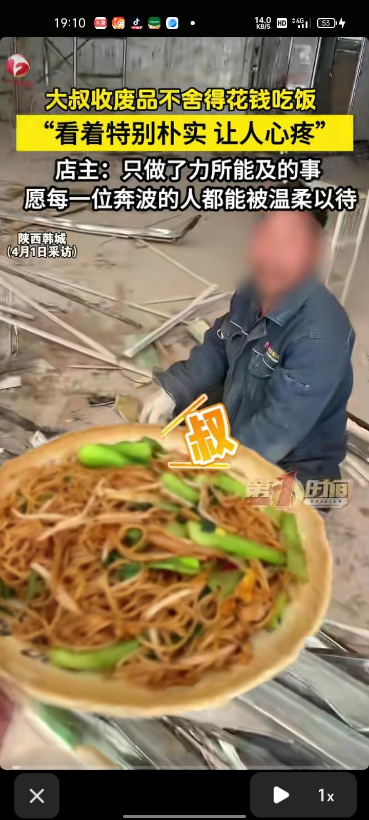 3月31日,渭南韩城市。店主李女士称,新店装修清出一堆废品,门口来了位收破烂的大叔。当时大叔进店里时,工人刚准备出去吃饭,她想让大叔一起去吃,可大叔不舍得花钱,说请客也不愿意去。看着特别朴实,大叔为了省钱也不舍得吃饭,看着很让人心疼。最后,她给大叔买一份饭和水送过去,吃完饭大叔非要给她钱。赠人玫瑰手留余香。愿每位辛苦奔波的人都能被温柔以待