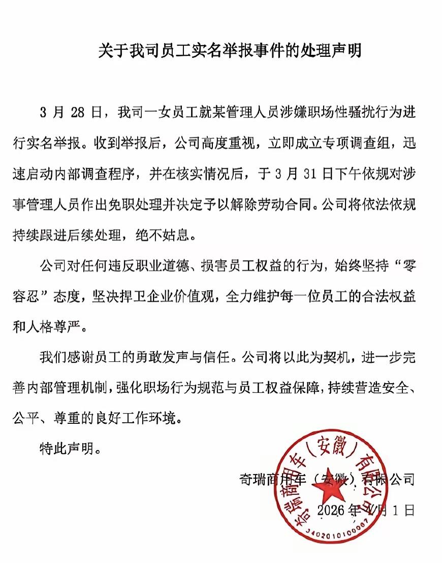 奇瑞这办事效率相当给力呀!28号才爆出的事儿,31号就把那高管给开了,那个左所长不知道慌不慌?奇瑞给你打了样! 00后员工整顿职场真不是盖的,管你三七二十一,爱谁谁!谁也不好使!遇上事真敢站出来怼!有了这个样板,奇瑞内部估计不会有人再作妖了。 奇瑞