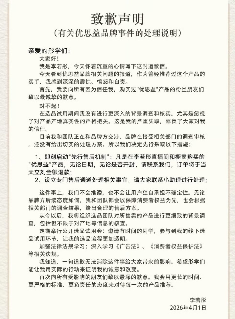 李若彤发布致歉声明4月1日,央视新闻报道,通过樱校制造火爆全网形象的“澳洲优思益”,澳大利亚地址是一家汽车维修厂,“进口”是包装的、品牌故事是编的、国际大奖是买的、专家网红是雇的。随后给该品牌直播带货过的李若彤、章小蕙分别发表声明,給顾客退货退款。不得不说,产品虽然是山寨的,单这一波带货明星的反应速度、应对措施还是不错的。该承担的就承担,没有甩锅没有推托责任,还是很主意自己的形象和口碑的,。这一波为老牌艺人点赞!希望下次挑选合作方的时候能擦亮眼睛吧。