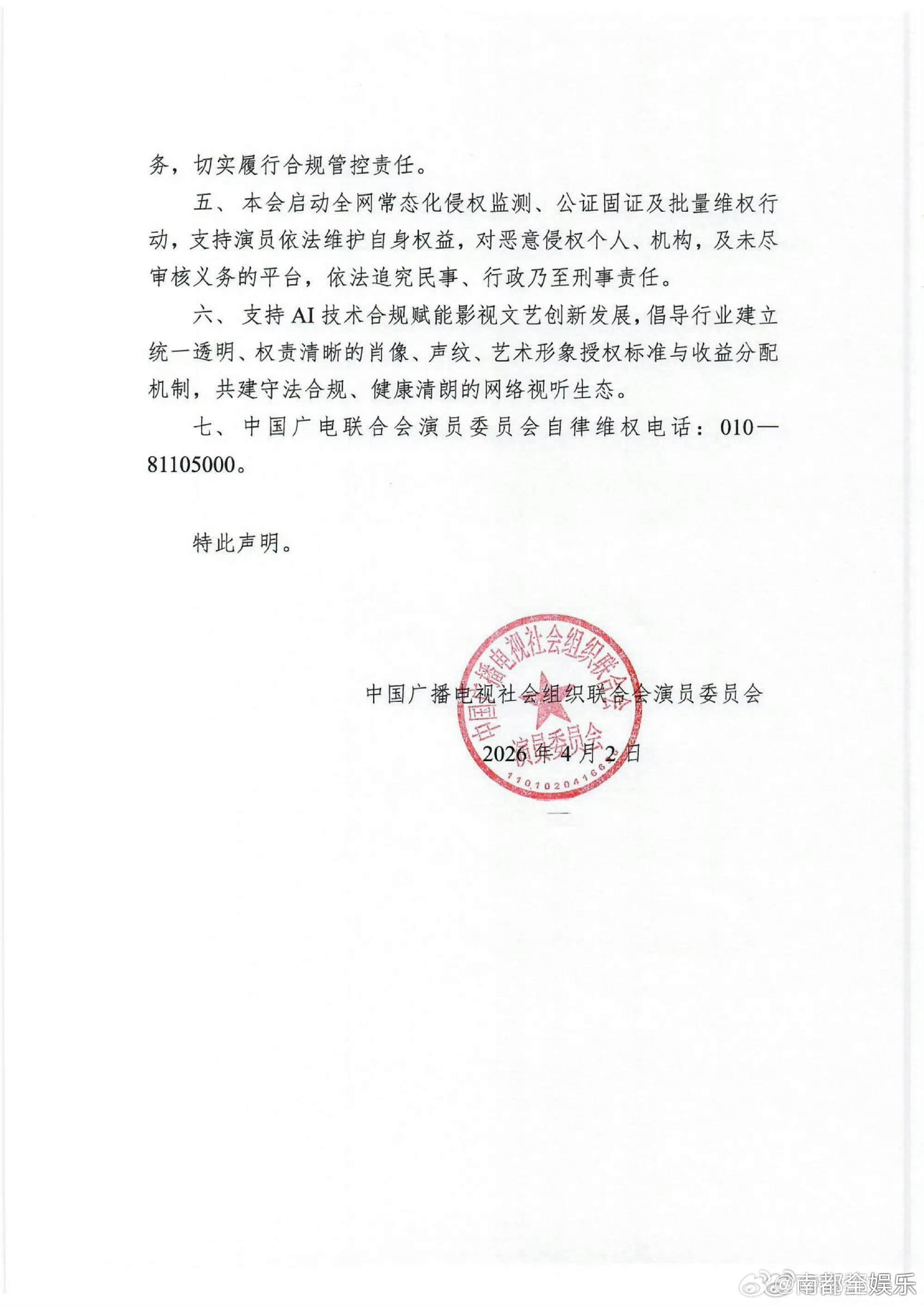 中国广电联合会演员委员会就AI侵权发声明2日,中国广电联合会演员委员会就当前AI
