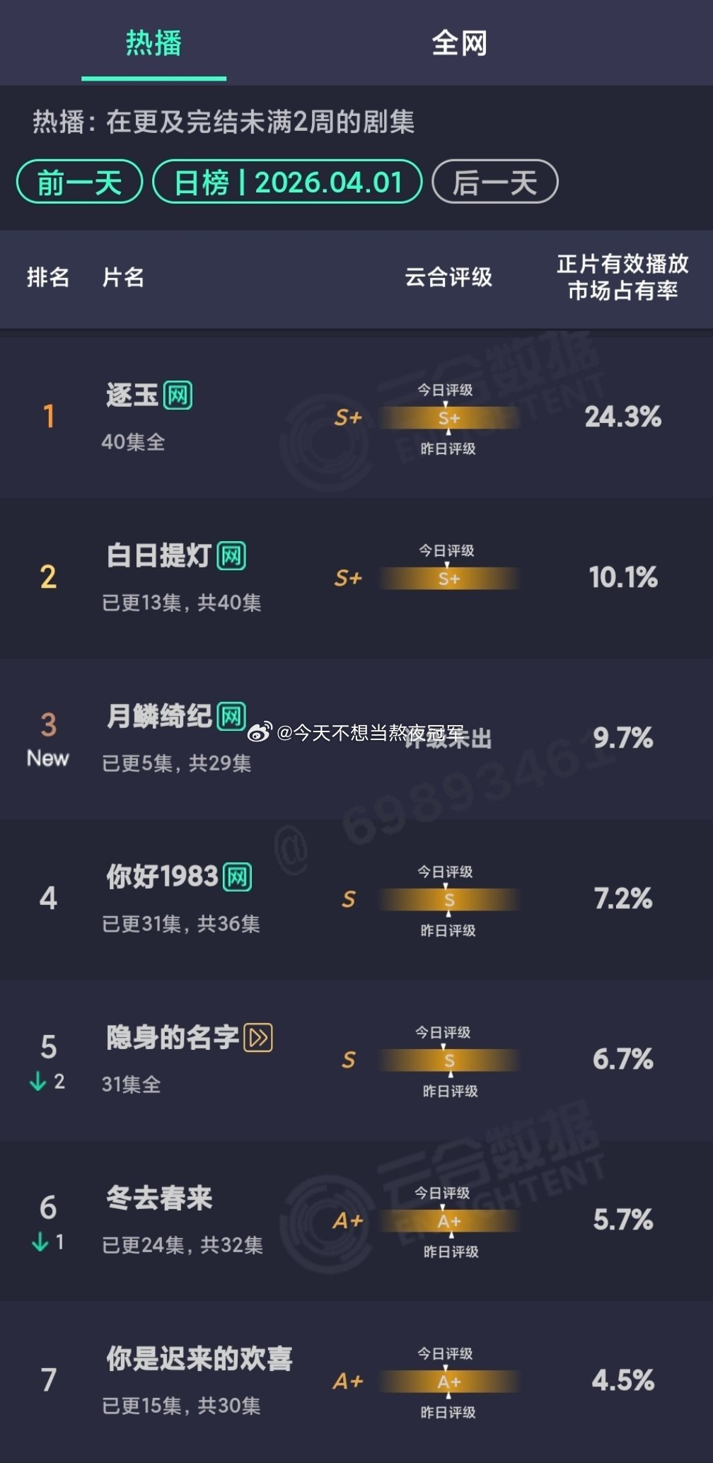 迪丽热巴 陈飞宇《白日提灯》昨日云合占比10.1%,播放量预估2200w,评级S➕,这几天工作日占比都是保持在10%左右
