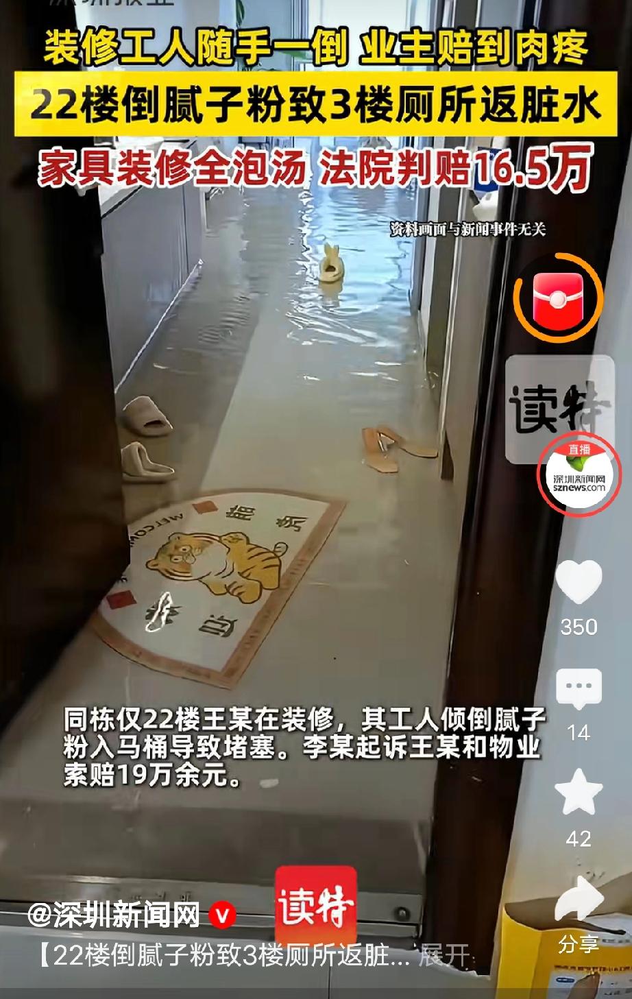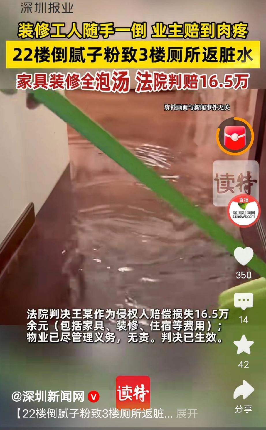 冤不冤?广东深圳,男子请工人装修房子,工人图省事把多余的腻子粉倒进马桶再冲水,不料,腻子粉结块把排污管堵死,让3楼用户地漏、马桶大量返脏水,导致新房地板变形、定制柜发霉、墙面污损,损失惨重。3楼业主把男子和物业告上法庭,男子大喊冤枉,声称是工人倒的,与他无关。可法院判决直接让他傻眼。 李某和王某是某小区同一栋楼的业主,李某是3楼业主,王某是22楼的。 两人差不多是同一个时间段装修的房子,不过李某家稍微早一点。 2023年5月份的一天,李某突然接到工人电话,说他家的地漏和马桶大量返脏水。 李某听了赶紧赶到新房,眼前的景象瞬间让他惊呆了,只见卫生间里地漏和马桶不停地往外喷脏水。 眼看着那脏水快蔓延到卫生间外面了,李某急得不知所措,工人告诉他估计是排污管堵了,李某听完赶紧给物业打电话告知情况。 之后经过物业排查,确认是排污管被堵了,整栋楼的主排污管道被腻子粉泥浆彻底堵死,从管道里掏出了大量结硬的腻子粉结块。 但是,这个腻子粉结块怎么来的呢,是谁往排污管倒腻子粉了? 为了弄清楚腻子粉结块的来源,物业又进一步排查,最终锁定了元凶。 他们注意到,整栋楼只有22楼王某家在装修,物业上门检查时,发现王某家的装修工人正在打扫腻子粉,而且卫生间马桶内还残留着没冲干净的白色污水。 最终证实了是王某家工人图省事,把装修产生的腻子粉直接倒进马桶、用水冲下排污管,最终才导致管道堵塞、污水倒灌。 王某听到这个消息,也是气不打一处来,好好的,非得整出这么一出。 找到元凶后,李某总算松了口气,不过他再回头看看自己的房子,依然很心痛,脏水还在不断往外喷,已经溢出卫生间门口来到客厅乃至房间里,全都被浸泡了,到处是黑乎乎的水,一进门就问到又脏又臭的味道。 李某一想就觉得闹心,房子装修已经接近尾声,眼看着马上就可以入住了,没想到出了这档事,投进去十几万,全部打水漂,这事谁整出来的必须得让他来负责。 事后,李某找到王某和物业,希望他们给自己一个说法。 可物业却说,业主在装修前都会跟他们签协议、装修废料该如何处置。 而且在事发前2个月,物业公司刚完成管道疏通,日常也履行了巡查义务,已尽到了必要的管理责任,因此不应该承担赔偿责任。 王某也大喊冤枉,说是工人自己倒进马桶的,跟他又有什么关系? 三方协商无果,最终,李某把物业和王某告上法庭,要求他们赔偿房屋装修修复、家具损坏、维修期间租房费用及鉴定、交通等维权相关损失合计19万元。 那么,王某和物业到底有没有责任赔这个钱呢?装修工需要负责人吗? 根据《民法典》第1192条规定,个人之间形成劳务关系,提供劳务一方因劳务造成他人损害的,由接受劳务一方承担侵权责任。 王某让工人帮忙装修房子,双方属于劳务关系,工人为了省事把腻子粉倒入马桶堵塞管道,属于履行装修工作时造成他人损害。 王某作为雇主应当直接承担赔偿责任,不能以自己不知情、不是自己倾倒为理由免责,工人存在重大过失,王某赔偿后可以另行向工人追偿。 根据《民法典》第942条规定,物业服务人应按约定维护共有部分并履行管理义务。 本案物业已提前签订装修管理协议,明确禁止倾倒装修垃圾,事发前2个月也对管道进行过疏通并日常巡查,已经尽到全部管理责任。 这一次堵塞完全是工人违规操作造成的,物业没有过错无需赔偿。 李某起诉主张的19万元包含房屋修复、家具损失、租房费用和鉴定、交通等维权开支,法院结合实际损失与证据材料,最终支持16.5万余元,判决王某承担全部赔偿责任。 很多人都觉得王某冤枉,毕竟不是他亲自倒的腻子粉,只是雇了工人就要赔十几万,换谁都觉得憋屈。但从法律和责任上讲,工人是他请的,装修是他的事,他就有看管义务,出了事雇主担责是规矩,所以情理上值得同情,法律上并不冤。 大家觉得王某冤枉吗?