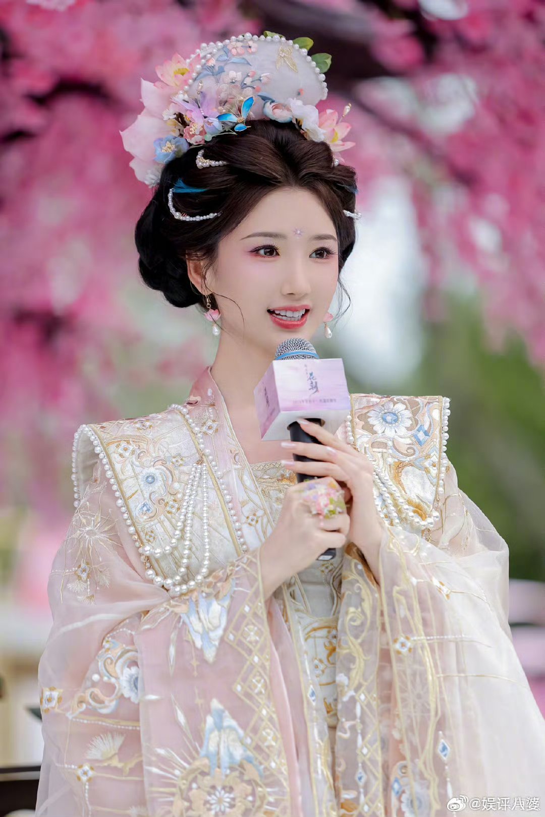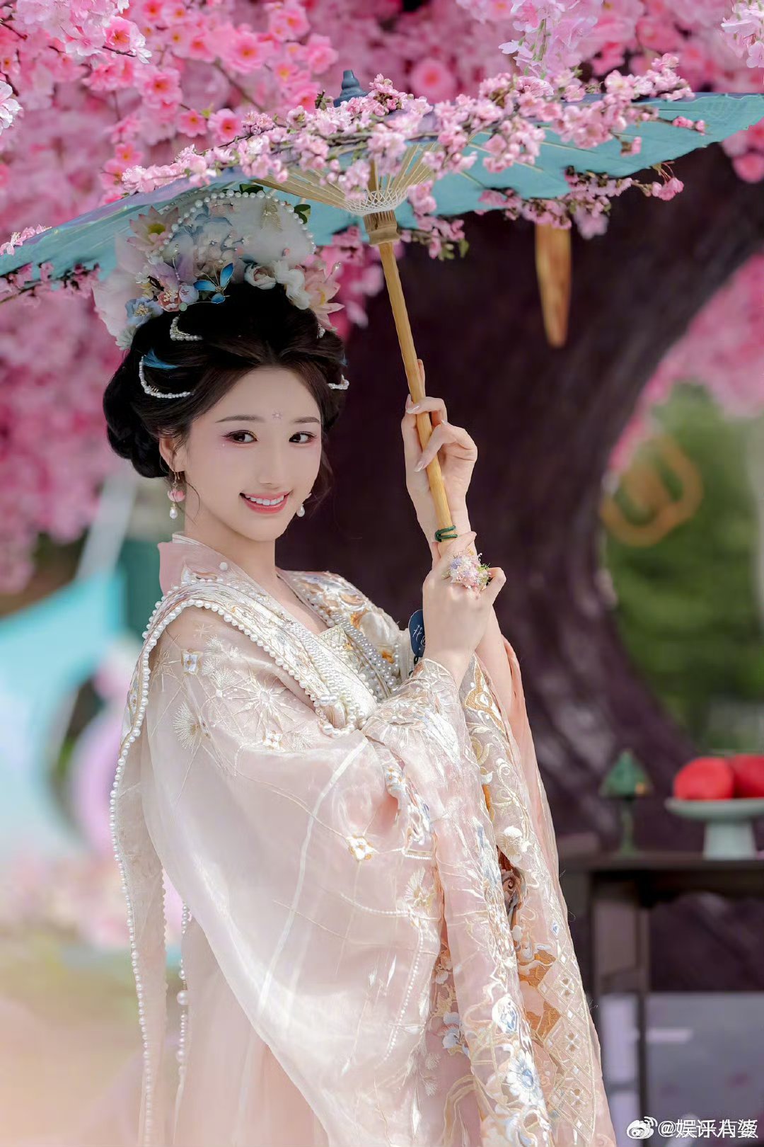 粉紫花神妆糅合春日灵气,浅粉花丝刺绣华服衬得毛晓彤温婉动人✨ 轻捻花枝倚油纸伞,