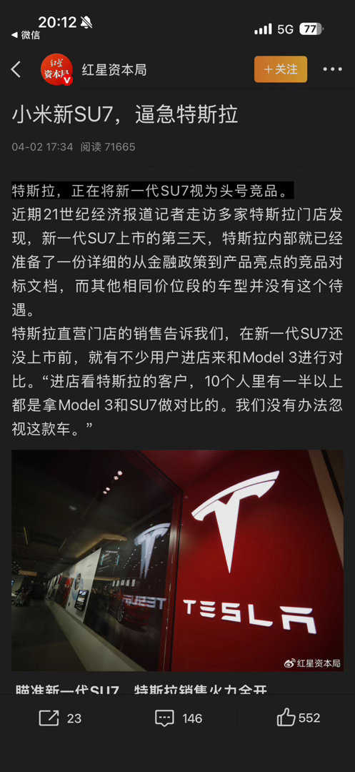 特斯拉直营门店的销售告诉我们,在新一代SU7还没上市前,就有不少用户进店来和Model 3进行对比。特斯拉内部把SU7列为头号竞品,特斯拉已经没牌了,产品力不行只能靠金融政策去卷;小米更从容,这次新SU7的升级很多,安全、智能操控都升级!