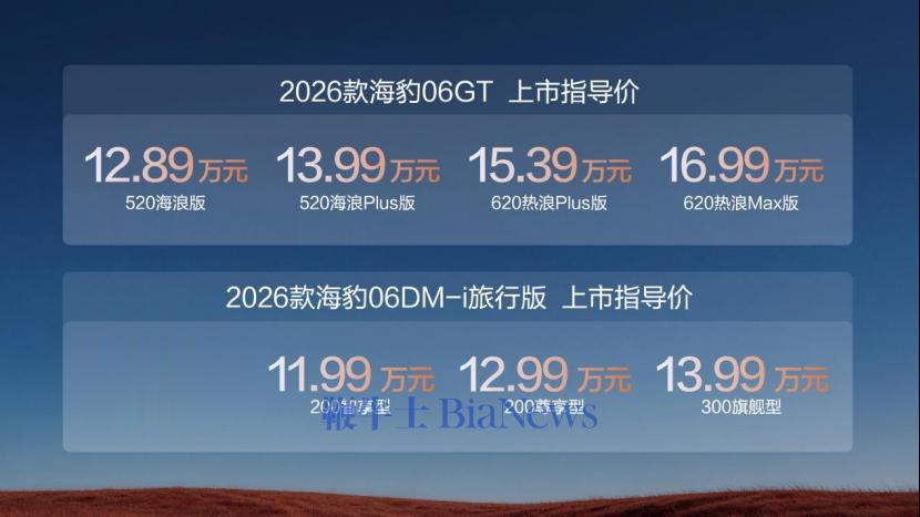 其中,2026款海豹06GT官方指导价为12.89-16.99万元,2026款海豹06DM-i旅行版官方指导价为11.19-13.99万元,两款新车还为用户提供涵盖购车、选装、养护等在内的多项权益,让用户真正实现无忧用车,2026款海豹06GT用户更可享受1年闪充补能权益,尽情领略全场景自由闪充的科技魅力。