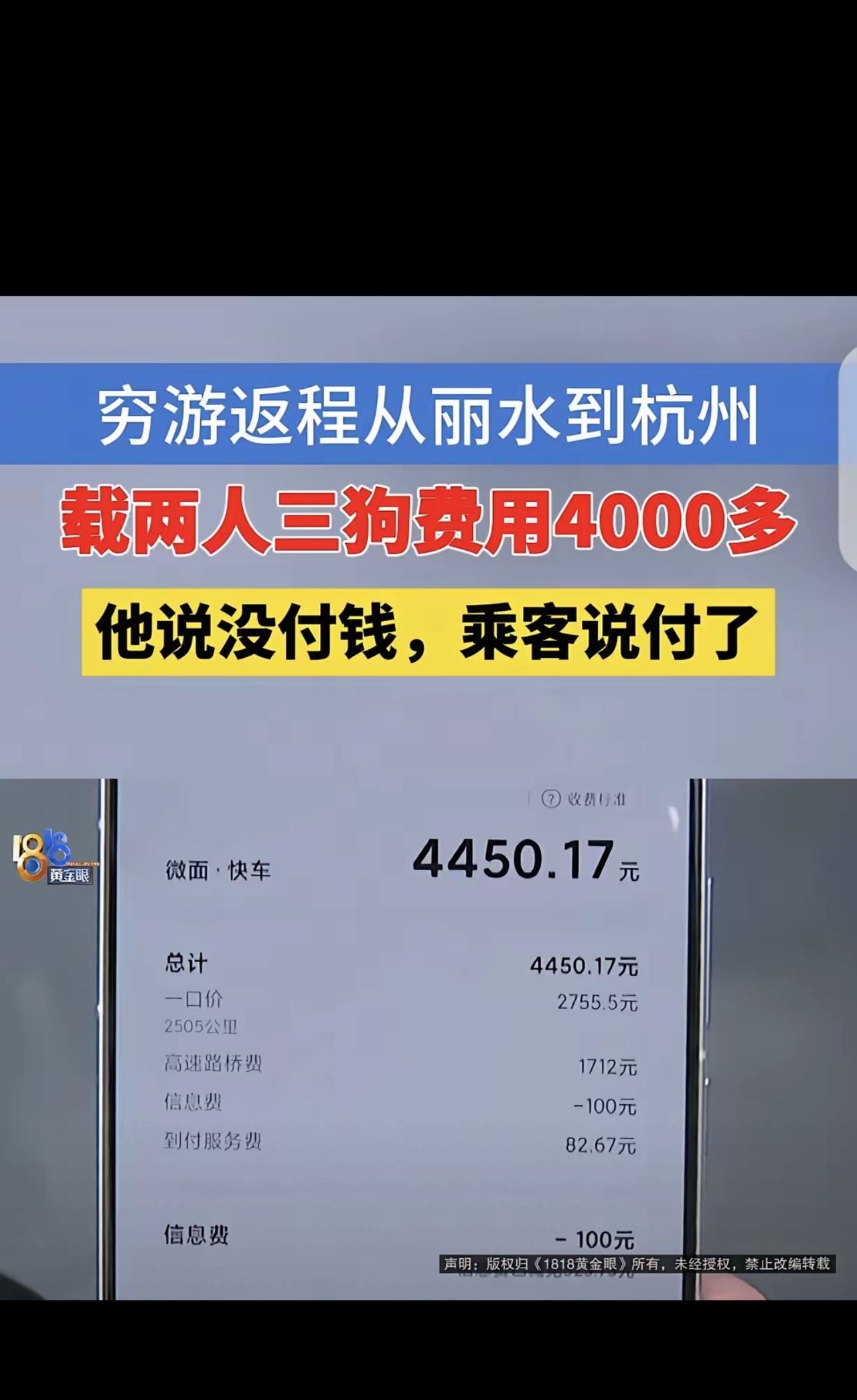 “玩不起!”浙江杭州,一男子开着面包车穷游西藏,为了省钱在丽江拉上2个女子,和她们的3条狗,全程2505公里,一共4550元车费,可到了地方,2女子说车费在平台支付了,30分钟到账,然后拍屁股走人,男子却一分钱车费没收到,平台说2女子取消支付了,2女子一口咬定,她们给过钱了,让男子不服就起诉报警。 浙江苏州的薛先生,为圆川藏穷游梦,开着旧面包车踏上旅途,一路风餐露宿本就不易,返程时的遭遇,更是让他憋满委屈。 为分摊油费,薛先生在丽江接了拼车单:两名女子带3条狗回杭州,全程2505公里,谈好车费4550元。他二话不说,日夜兼程开了整整两天两夜,安全将人、狗送到杭州目的地。 可到站后,两名女子却谎称已在平台支付,称30分钟内到账,说完便匆匆离开。薛先生心软轻信,结果等了许久一分钱没收到,联系平台才得知,对方压根没付款,还直接取消了支付订单! 更过分的是,薛先生上门讨要车费,对方不仅伪造付款截图狡辩,还态度嚣张放狠话:钱已付,不服就报警起诉!记者上门沟通,对方闭门不出还恶语相向,全然不顾司机两天两夜的奔波辛苦。 此事曝光后,网友瞬间怒了: “穷游司机本就不容易,白嫖两千多公里车费,也太没底线了!” “伪造截图耍赖,这不仅是没素质,根本就是违约违法!” “司机太心软,没见钱到账就不该放人,吃了大亏!” 平台已核实女子未付款,对其账号做封号处理。从法律来讲,薛先生已履行承运义务,两名女子拒付车费、伪造凭证,已违反《民法典》,不仅要结清车费,还得赔偿司机滞留损失。 顺风车本是互惠互利,却有人恶意消耗善意、耍无赖白嫖,这种行为既丢人品,又触法律,实在令人不齿。 你觉得薛先生该起诉维权吗?评论区说说看法!
