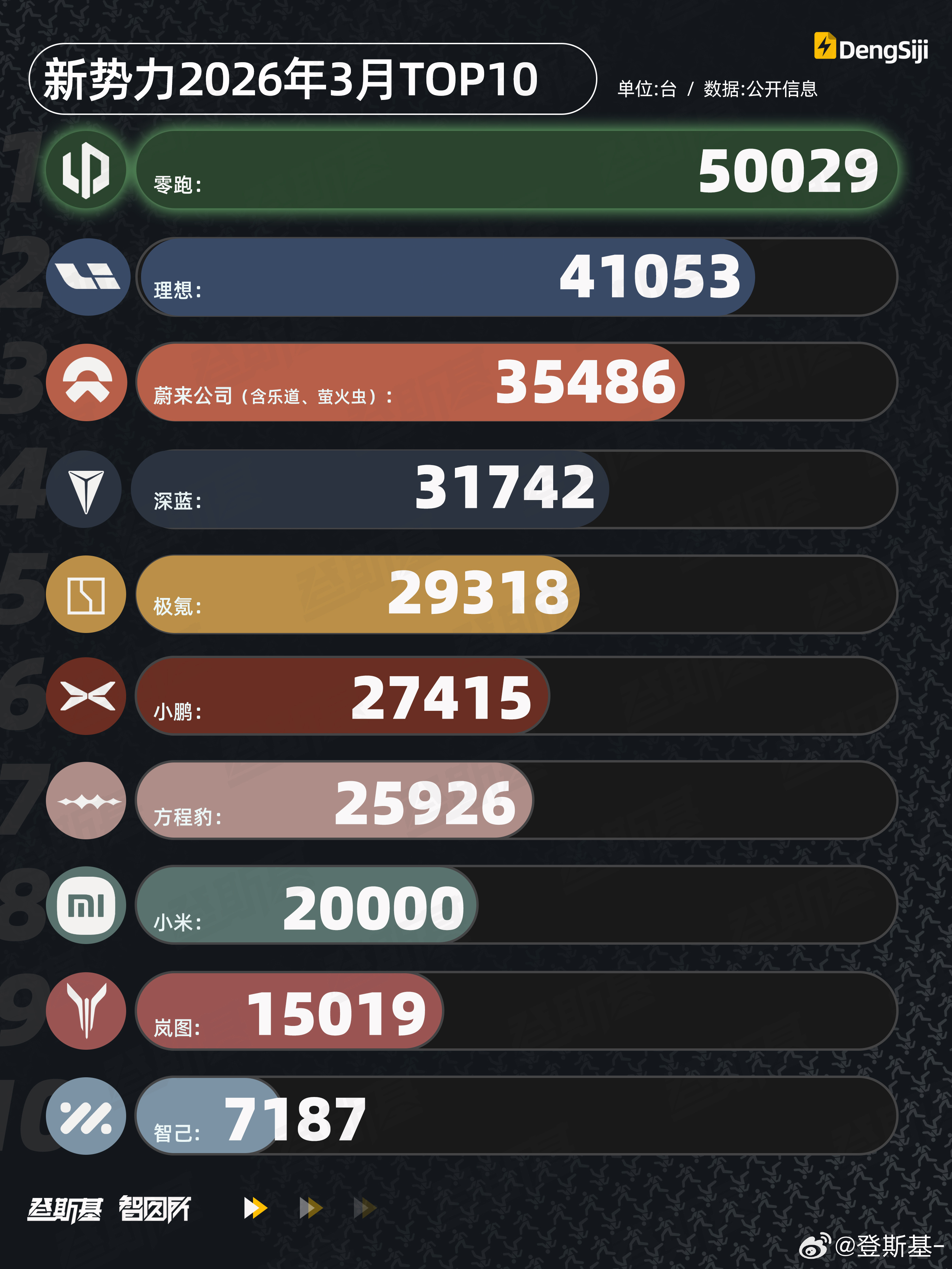 刚刚过去的3月TOP3分别是:1.零跑:5.0万台2.理想:4.1万台3.蔚来公司:3.5万台
