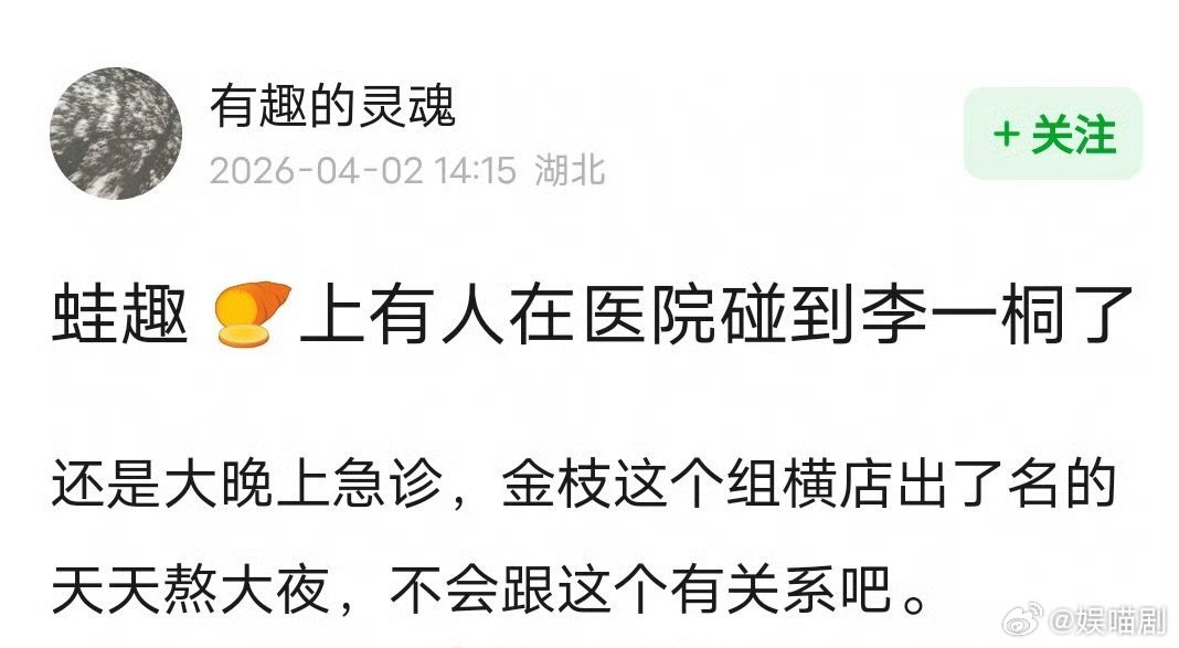 曝李一桐深夜进医院网友医院偶遇李一桐大家都在等你报平安。戏可以慢慢拍,但李一桐只有一个!快点好起来,我们只想看你活蹦乱跳的样子