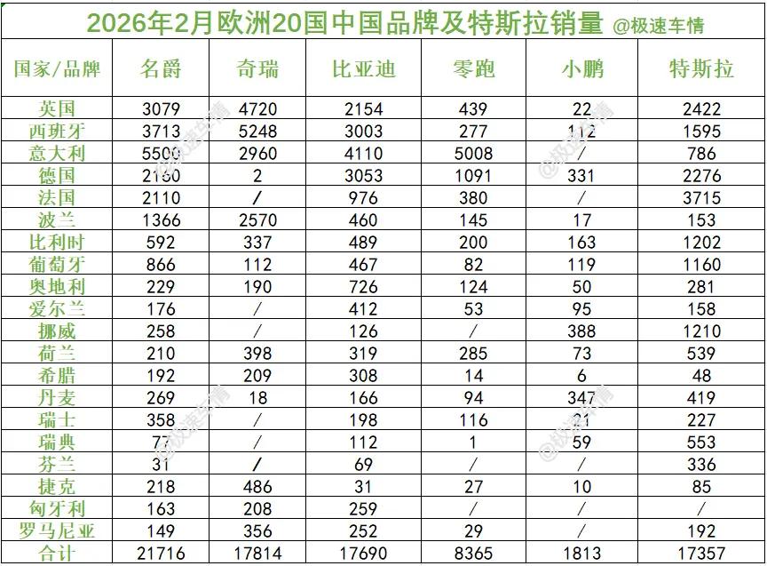 2026年2月,欧洲主要国家中国汽车销量。2月,中国汽车欧洲销量TOP5: 上汽名爵,奇瑞,比亚迪,零跑汽车,小鹏汽车!特斯拉连续两个月不敌比亚迪,比亚迪连续两月斩获欧洲最畅销新能源品牌!极速车情 厉害了我的车 比亚迪 奇瑞
