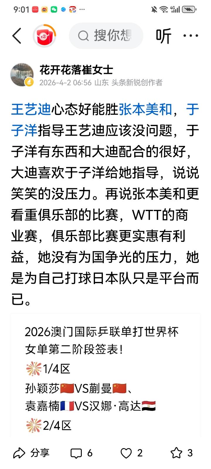澳门世界杯女单8强决赛,王艺迪4一1张本美和,看她们俩的比赛不像是一个性别的比赛 像小伙子打小姑娘[捂脸][捂脸][呲牙] 王励勤主席,秦志戬总教练,马琳指导,队友覃予萱一起在前排为王艺迪加油。[赞][赞] 我判断准确赛前我说,王艺迪心态好完胜张本美和,年轻教练于子洋有东西贼着呢,王艺迪他喊洋哥,两个人说说笑笑,配合默契大迪没压力。 这次也给蒯曼做外战指导,蒯曼表现不错,年轻教练没架子不严肃,队员们没压力放得开。
