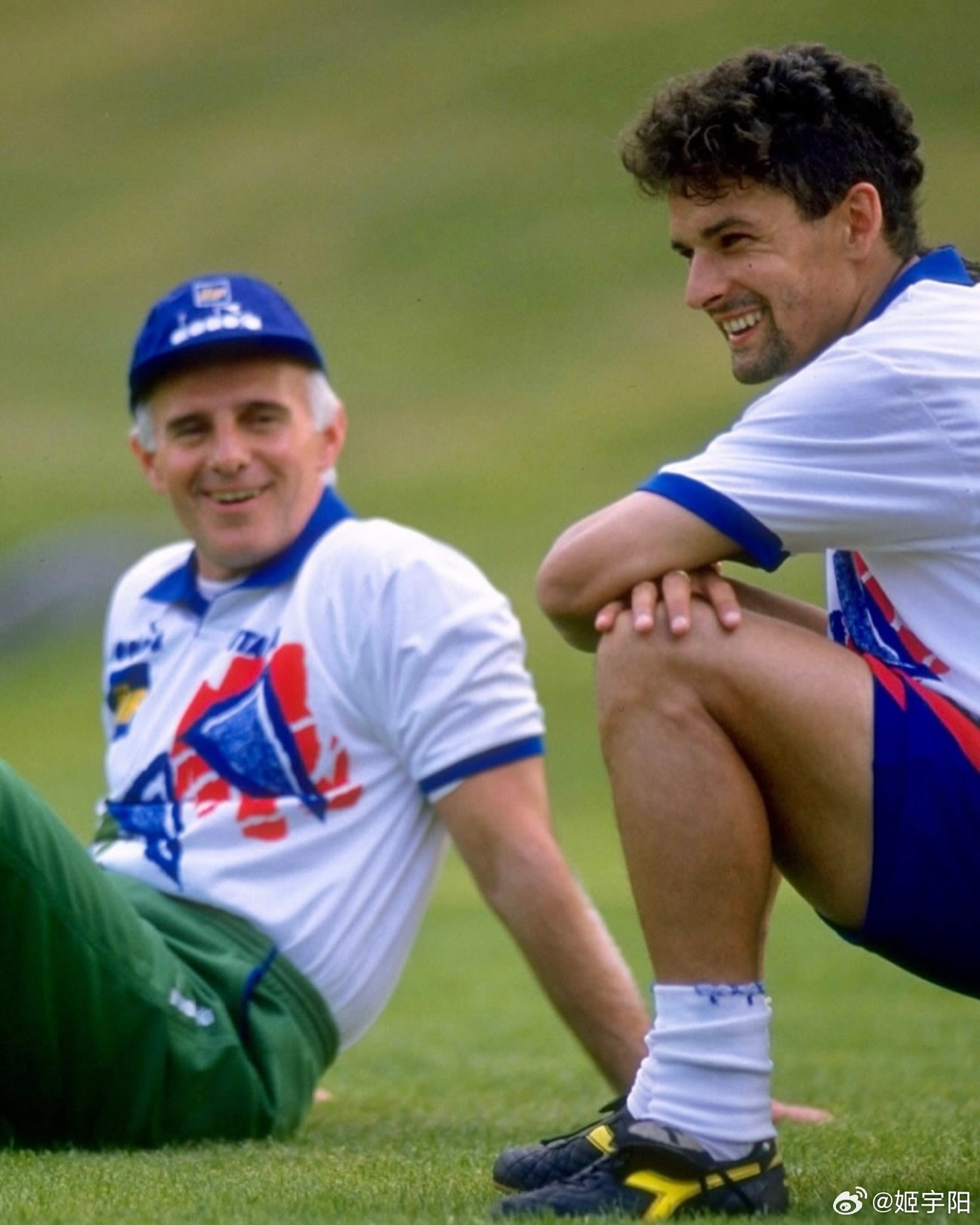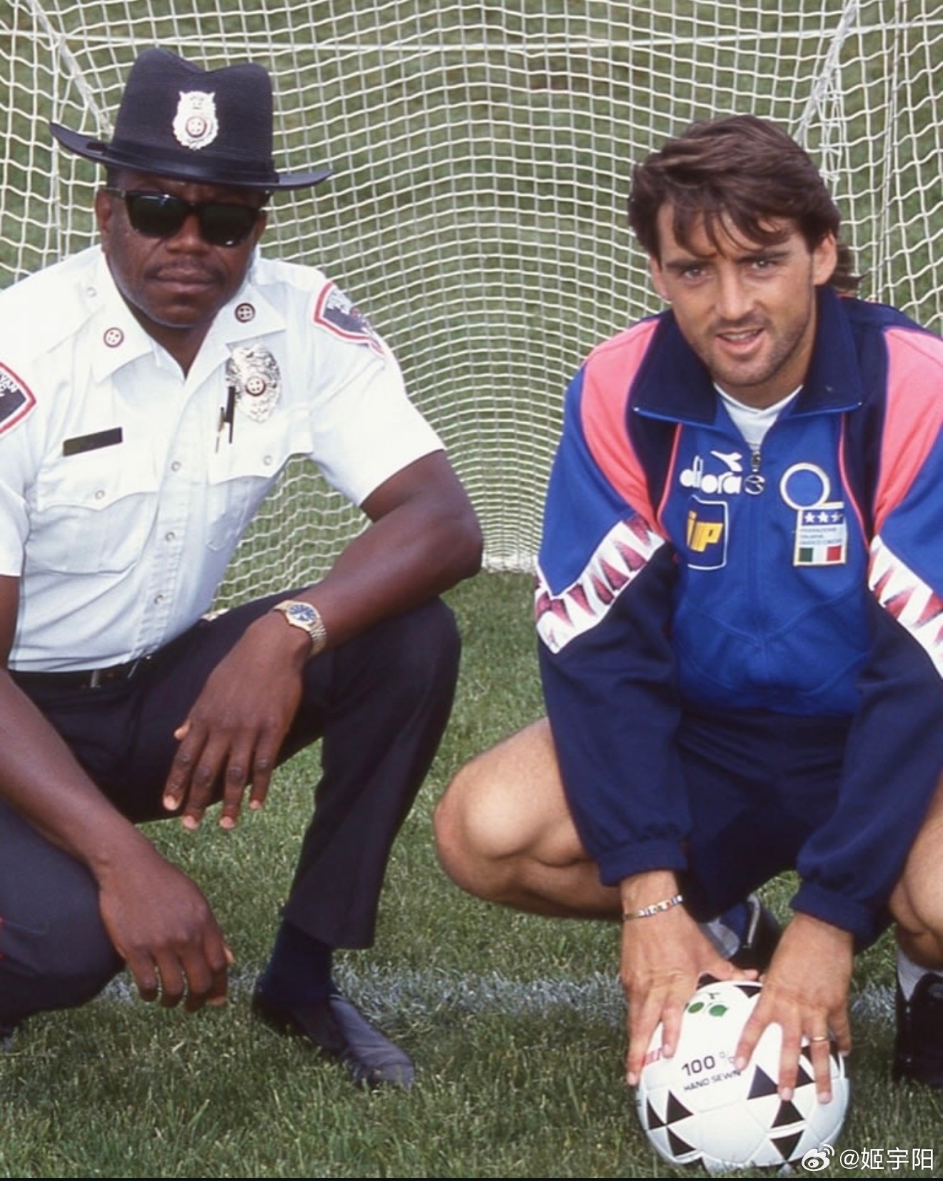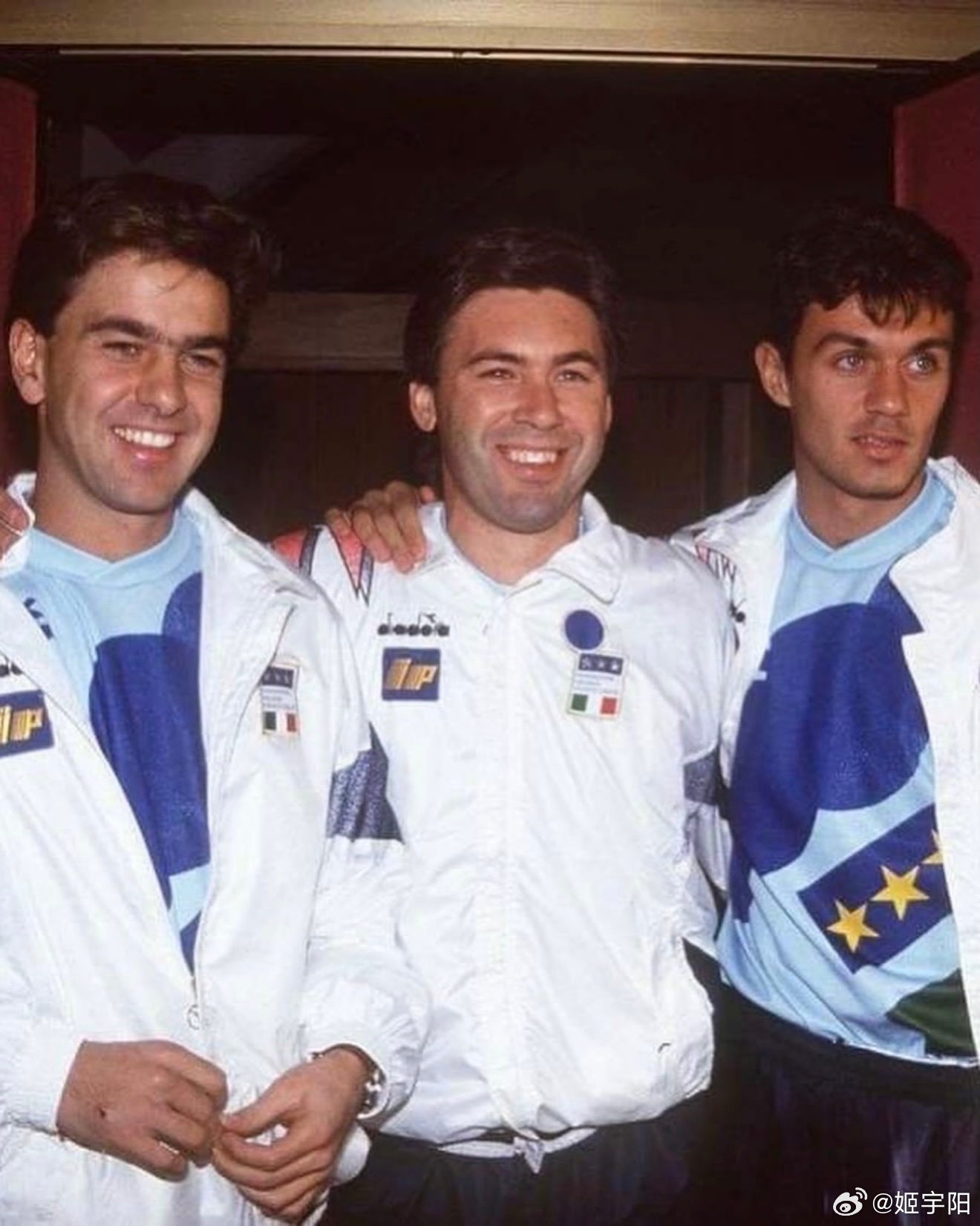 蓝色军团的【美国往事】自 1994 年之后,世界杯时隔 32 年再次回到美国。但蓝色军团意大利队却未能和世界杯一起故地重游。我们只能通过一组珍贵的旧照,回忆意大利上一次在美国参加世界杯的一些难忘瞬间。1994 年那支意大利队真的是人才济济,除了如日中天的球星巴乔、马尔蒂尼等等之外,好几位日后成为名帅的角色,当时也在那支参加世界杯的意大利队里。比如图三里这个背影,就是那届世界杯意大利 15 号孔蒂,后来作为主教练执教过尤文图斯、意大利国家队以及切尔西等队。目前是那不勒斯主教练,也是历史上首位率三支不同球队夺得意甲冠军的教练。图 四 中间这位,正是 现任巴西队主帅安切洛蒂。安切洛蒂之前也是意大利国脚 ,1994 年世界杯,刚刚退役的他以主教练萨基的助理教练身份,跟随意大利队一起征战了那届世界杯。图 六 这位就更不用介绍了,熟悉的曼奇尼。同样作为主教练带领意大利队 2021 年登顶欧洲。目前是在执教卡塔尔球队阿尔萨德。在球员层面,罗伯特·巴乔无疑是那届意大利队最耀眼的球星。1994 年世界杯之前, 巴乔是以 1993 年度世界足球先生和金球奖(欧洲足球先生)双料得主的身份,跟随意大利队一起来到了美国参加世界杯。巴乔当时在足坛的威望,通过两大奖项的得票数就可见一斑。 1993 金球奖(Ballon d'Or),巴乔得分是 142 分,排第 2 的博格坎普是 83 分,排第 3 的坎通纳是 34 分。1993 世界足球先生(FIFA World Player)票数,巴乔是 152 分,第 2 名罗马里奥是 84 分,排第三的博格坎普是 58 分。1994年美国世界杯,巴乔淘汰赛阶段独进5球,率队杀入决赛,但决赛点球射失,意大利憾负巴西。罗伯特·巴乔是唯一一位三届世界杯都有进球的意大利球员。4 年后的 1998年法国世界杯,巴乔代表意大利参加最后一届大赛。贡献3球2助攻,帮助意大利打进八强,点球大战不敌法国无缘四强。1994 年世界杯决赛,巴乔在和巴西最后点球大战中踢飞点球的一幕,成为了世界杯历史上最让人心碎的场景之一。而这一幕画面,也把忧郁王子的称号与他彻底绑定。意大利连续3届无缘世界杯2026美加墨世界杯