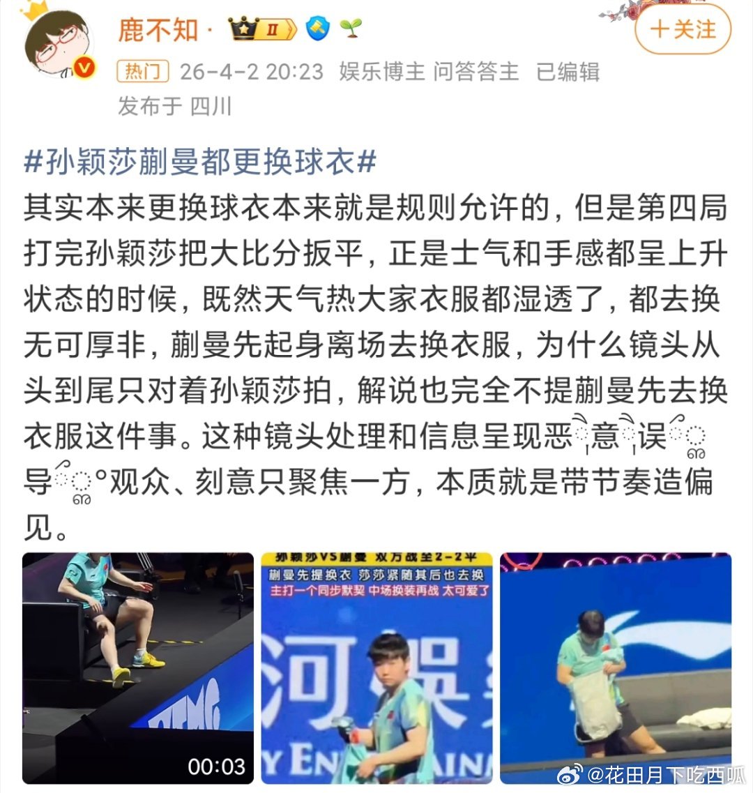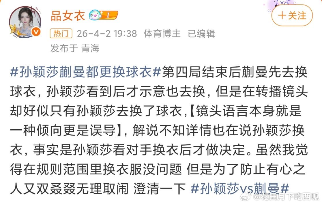 虽然在赛制内运动员换衣服本身就没问题,但怎么感觉镜头和有些报道在刻意引导孙颖莎刻意提出换衣服的要求?事实上明明是蒯曼先提出的啊,可镜头却一直在怼着孙颖莎,就蛮离谱的、、、、孙颖莎蒯曼都更换球衣孙颖莎vs蒯曼
