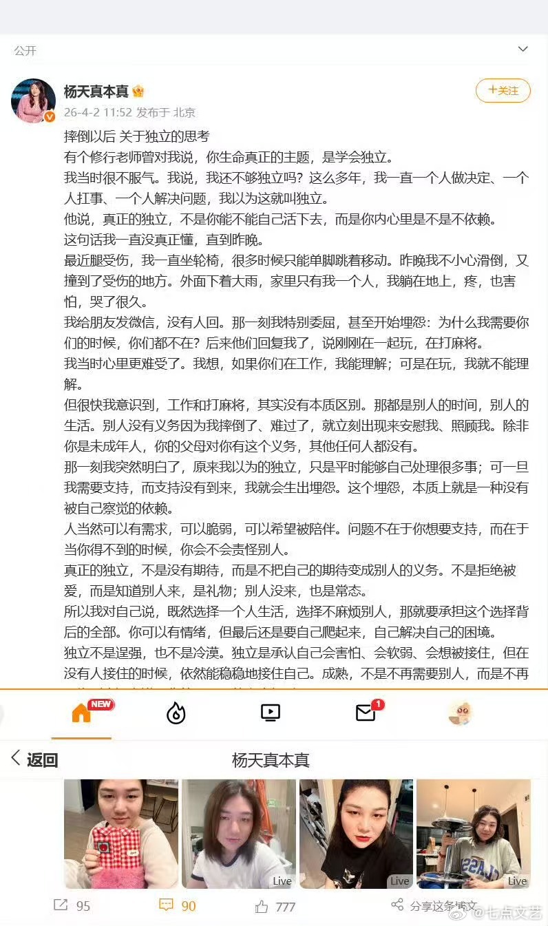杨天真腿伤还没好又滑倒了 腿伤还在恢复就遭遇二次滑倒,实在令人担忧。希望她能好好静养,减少不必要的折腾,安心养伤,尽快恢复正常状态