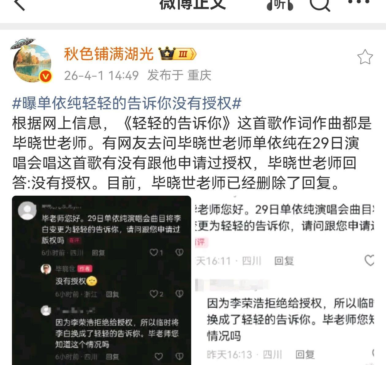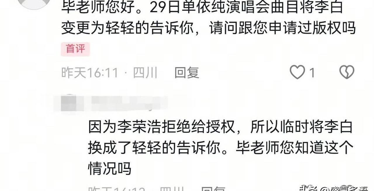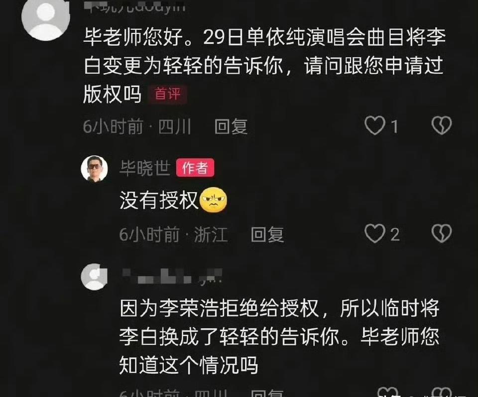 单依纯连遭版权风波 临时换歌再翻车 主办方操作又被质疑 四月一日这天,瓜又来,前脚刚因李白道歉,后脚临时换歌,又被指没授权,真有这么巧吗 事情怎么串起来的呢,原本演出曲目里有李白,作者李荣浩明确不同意授权,主办方临时改方案,换成了轻轻的告诉你救场,然后呢,网友去私信词曲作者毕晓世,据称收到回复没有授权,这条回复很快被删除,热度一下就起来了 两次事故像复制粘贴,一次没拿授权就安排上台,被作者公开维权,临时换歌又跳过审核,流程没跑通,人先上阵,这不就又翻车吗,临时就能绕开版权吗 单依纯这边,前两天刚道歉,说会重视版权,会承担责任,后来这回换歌又出问题,尴尬不尴尬,艺人要不要背锅,还是主办方该扛,谁来给个说法 简单说,现场唱别人的歌也要授权,不是发歌上架才算用,涉及词曲、表演、视频回放,一个环节漏了,都可能踩线,歌单临时改,后台要再核对,再对接版权方,再留书面记录,这些都要做,不是临时就能省一步 有网友晒出私信截图,说毕晓世回复没有授权,很快又看不到了,这删回复,是怕引战,还是沟通还没同步,外人不好下定论,不过删了反而更容易被解读,舆论一热,节奏就乱 这事还有个核心点,主办方有没有预案,有没有常备的清洁曲库,随时可用的授权清单,有没有一键切换的保险包,演出行业临时救场常见,但流程总要在,先唱后补,不稳定,也不专业,真就没有人卡口把关吗 有人说艺人也该长心眼,确认清楚再唱,不少人认为演出是团队协作,艺人在台前,背后执行靠主办方和音乐总监,两边都要负责,站哪边,都有话讲,这么拉扯下去,谁都不好看 别忘了,李白风波还没完全消停,轻轻的告诉你又把她推回中心,这么连续出事,口碑肯定受伤,主办方也被盯紧,后续商演会不会受影响,下一场怎么安排,歌单怎么审,能不能一次过,这些问题,不解决还会复发吗 说到底,版权意识这几年提上来了,是好事,但意识要落地,得变成流程,变成表格,变成开场前最后一次核对,别把临时当借口,别让艺人上台才发现踩雷,观众买票也希望安心看演出,不想看拉扯和维权 这事会不会有后续澄清,会不会补手续,会不会公开道歉,等一等吧,你怎么看呢