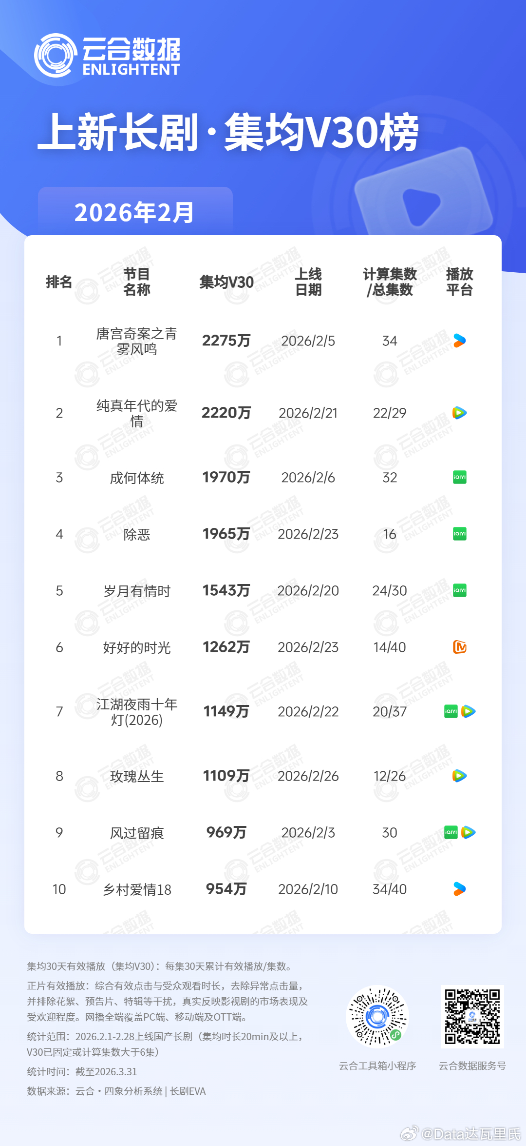 2026年上线云合长剧1-2月集均V30播放量2000+万:唐宫奇案、纯真年代的爱情(未固定,还有7️⃣集不知道会不会卡9)