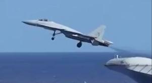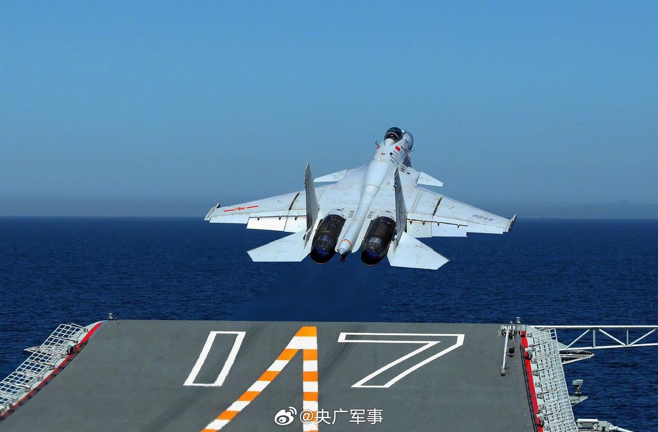 山东号航母上的歼-15T重型机,有一架正在滑跃起飞中,另外两架在甲板上等待任务中。有意思的一点,歼-15T在滑跃起飞时,前部鸭翼处于较大攻角状态,给飞机一个较大的低头力矩,这个和之前歼-15基本型差异明显,难道是换装AESA主动相控阵雷达之后,机头重量降低,需要抑制一下抬头力矩?