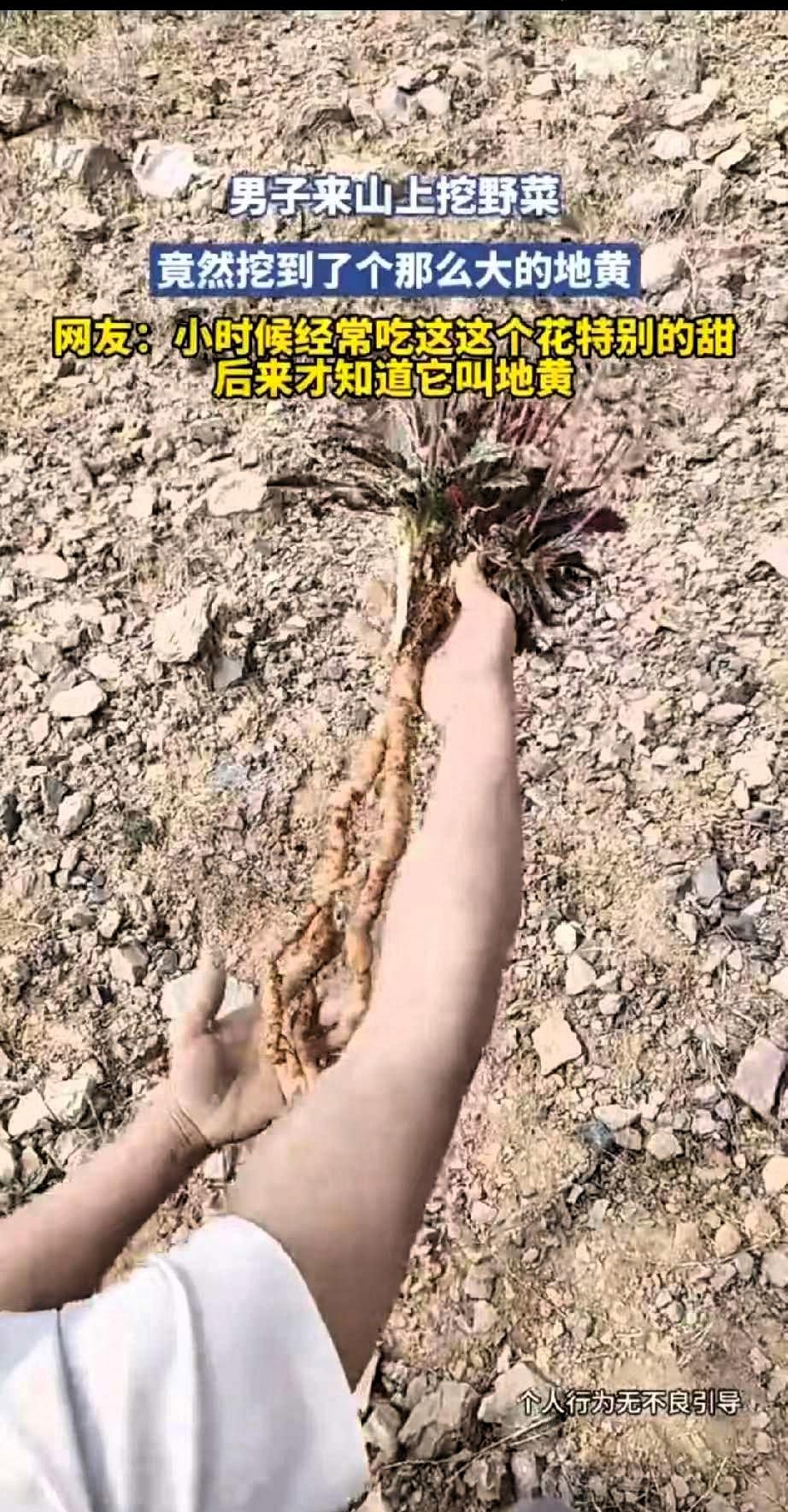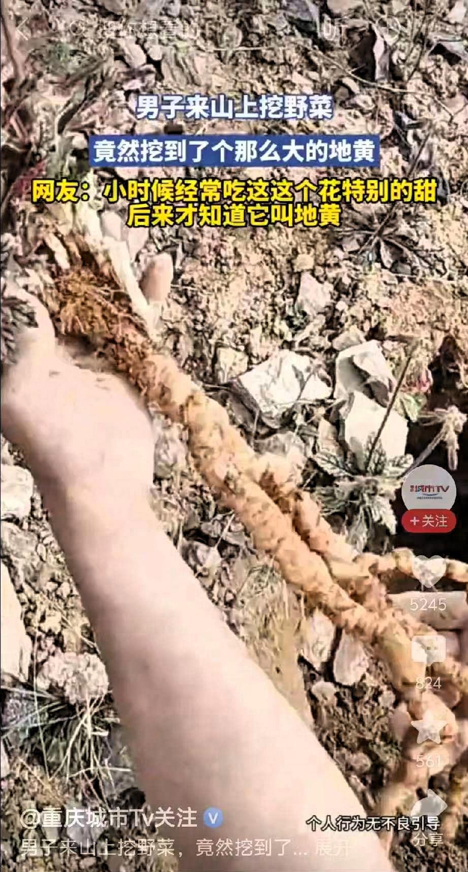真是活久见!4月1号,重庆一男子上山挖野菜,本想挖点蒲公英,荠菜,回家尝鲜,意外挖到一株体型格外大的野生地黄,在当地引起不少人关注。 这位市民平时就喜欢在附近山上挖些荠菜、蒲公英之类的野菜,当天和往常一样挎着竹篮上山,无意间看到几株开着淡紫色小花的地黄。原本只是想随手挖几株回去泡水,没想到下锄后感觉土质异样,慢慢清理开泥土后,才发现这株地黄的根茎远超常见大小。 他怕损伤根茎,便用手细心清理泥土,前后花了半个多小时才将整株挖出。这株地黄根茎粗壮,分量也很足,和平时常见的细小地黄差别明显,附近不少村民路过看到,都表示很少见到这么大的野生地黄。 有了解中药材的网友说,野生地黄生长速度较慢,对生长环境有一定要求,能长到这样的体型,说明已经生长了较长年份。这株地黄能被完整挖出,也算是一次难得的偶遇。 这件事在网上传开后,不少人也回忆起小时候在野外挖野菜、认识植物的经历。大家感叹的不只是这株地黄少见,更是这种贴近自然的简单乐趣。 其实上山挖野菜、寻野货,更多是享受户外活动的过程,意外收获只是锦上添花。野生植物生长周期长,自然形成不易,我们在接触自然的同时,更要做到合理采摘,不随意破坏植被,不盲目采挖不认识的植物,避免误食有毒种类,也保护好身边的生态环境。 人与自然和谐相处,才能长久保有这些朴素的小美好。