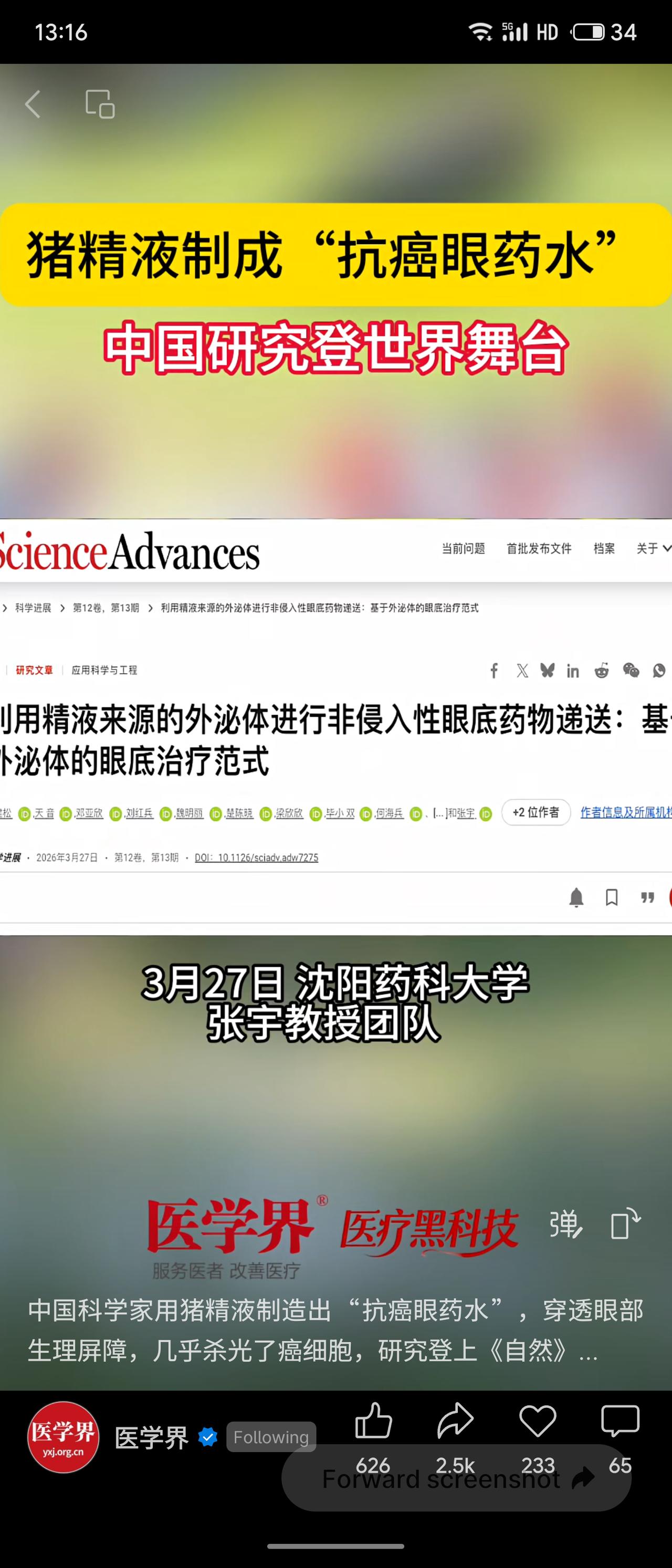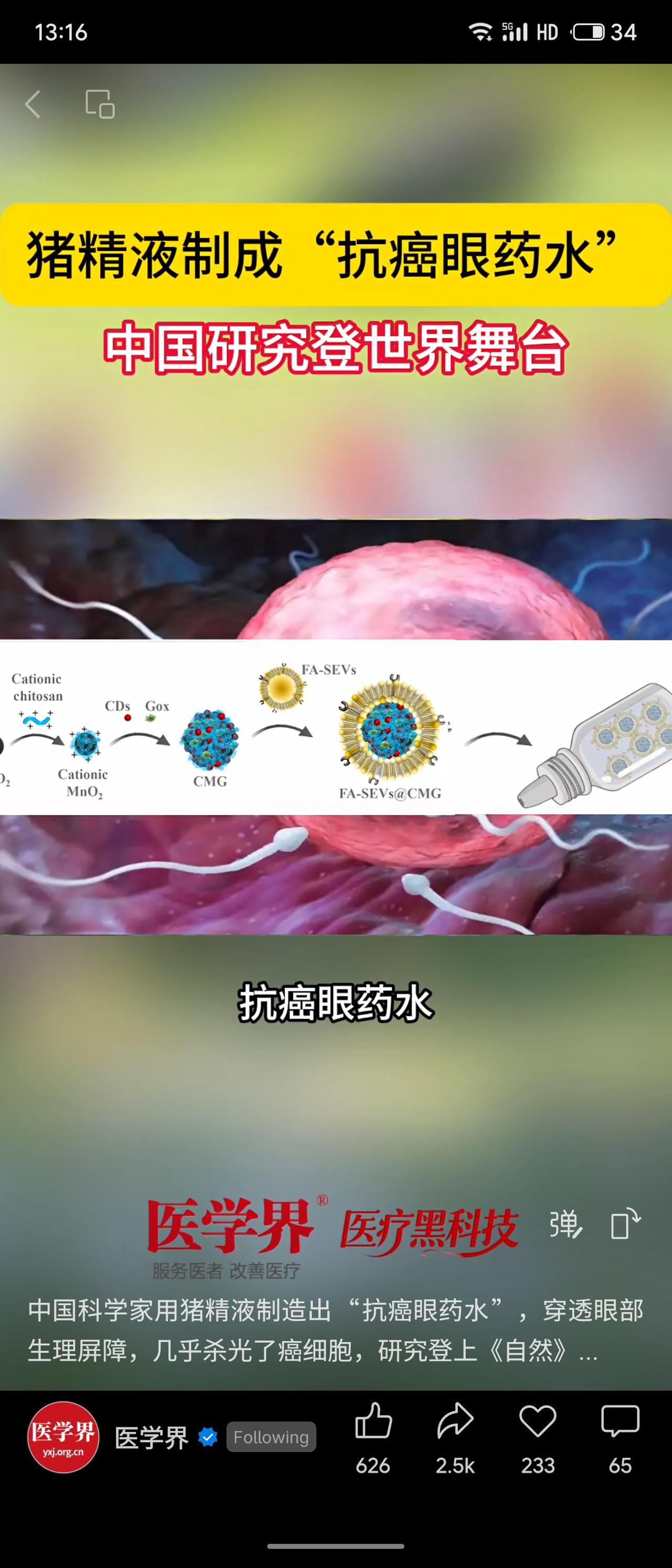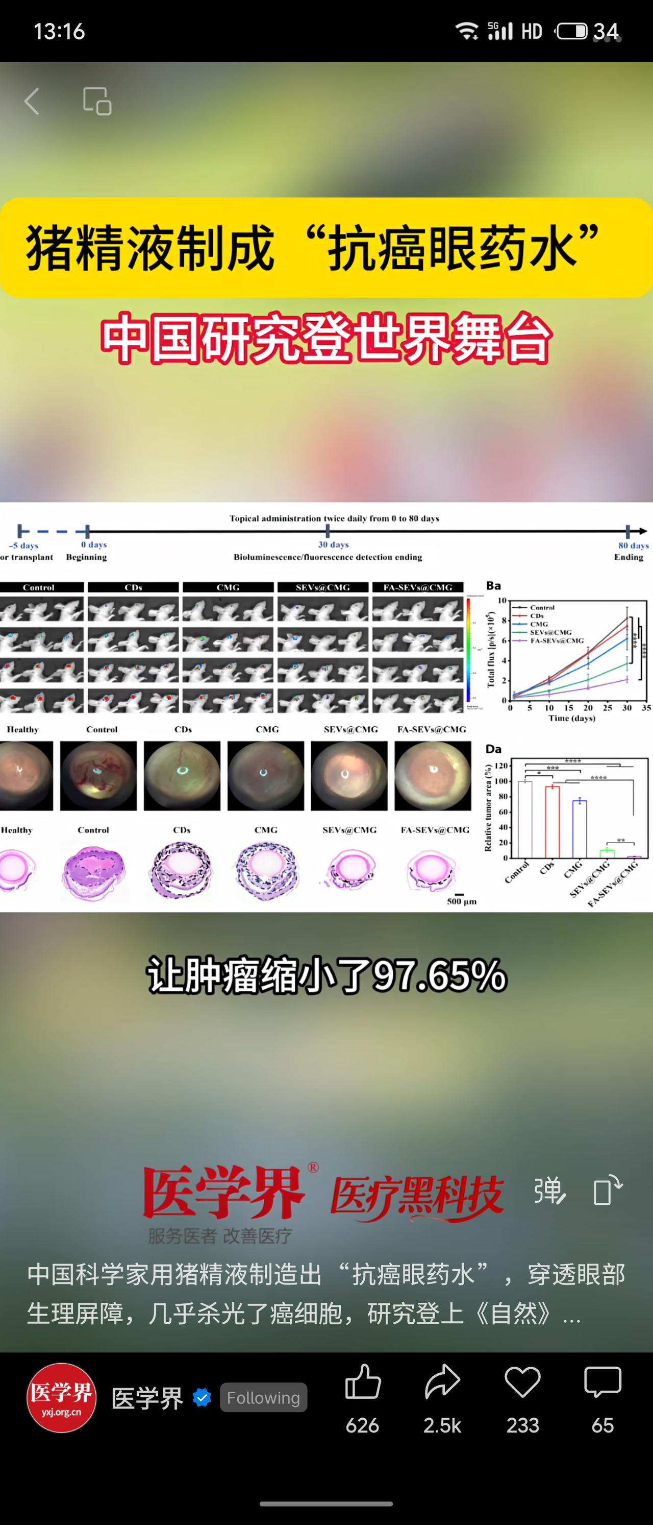 中国科学家利用猪精液提取外泌体,制成新型“抗癌眼药水”,可穿透眼部生理屏障,实现非侵入性眼底药物递送。实验显示能使肿瘤缩小97.65%,研究成果登上《自然》子刊《科学进展》。这一创新为眼底疾病治疗提供了全新思路,展现了生物材料与药物递送技术的巧妙结合,具有重要临床转化潜力。