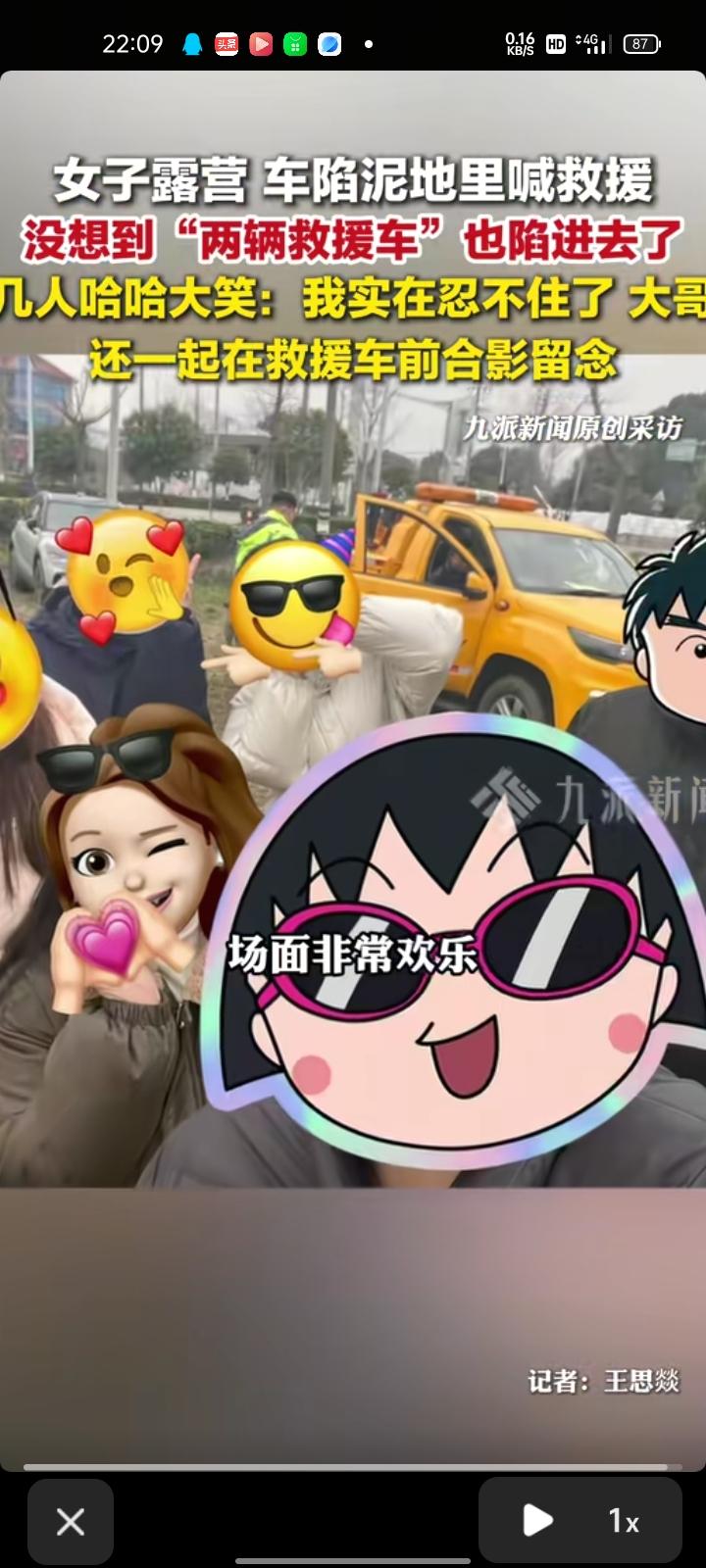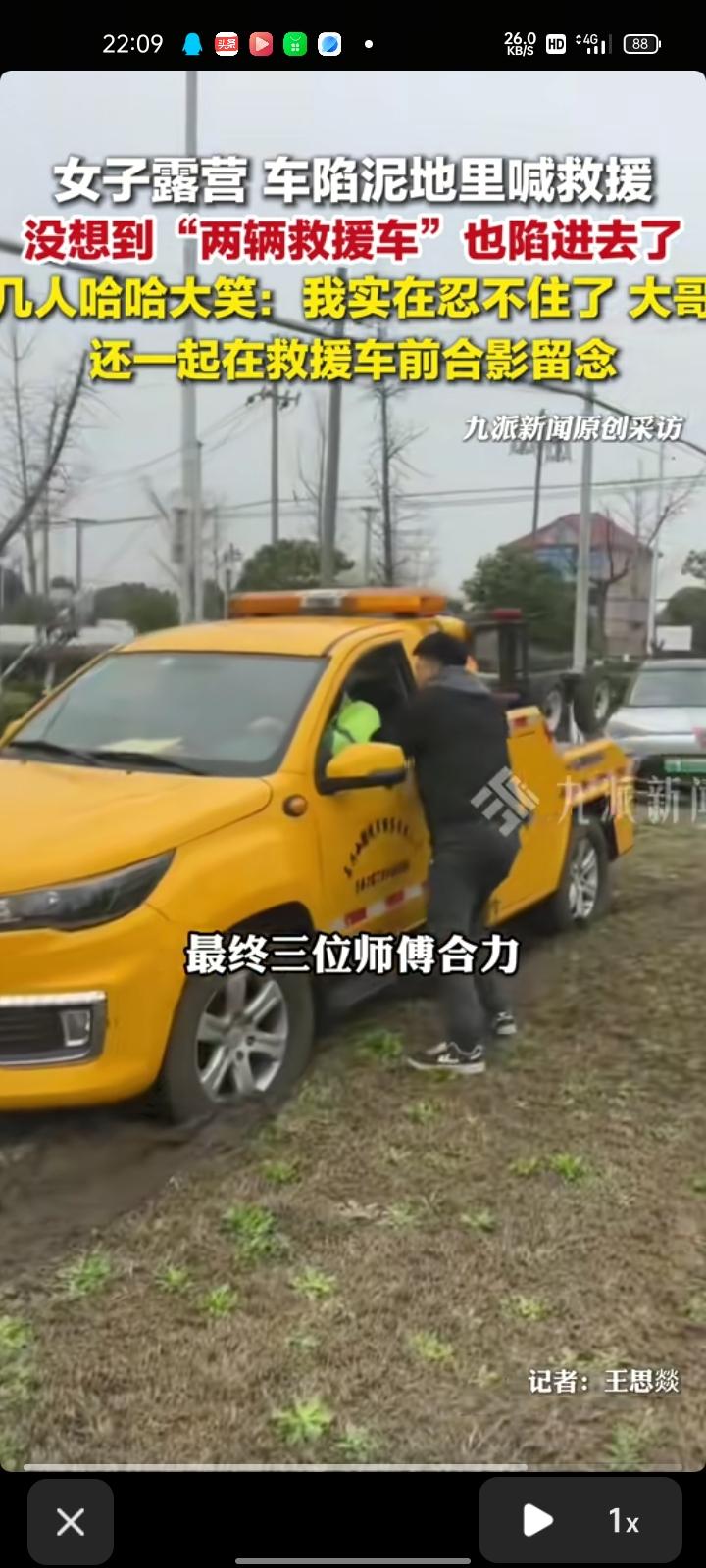 4月2日,浙江嘉兴。女子去露营,车陷泥地里喊救援,没想到两辆救援车也陷进去了,几人哈哈大笑。 沈女士介绍,第一辆救援车是板车,停在朋友车旁边,没想到不到一分钟就陷进去了。20分钟后,第二辆救援车抵达,这回来的两个司机师傅十分自信,表示自己是四驱救援车,绝对陷不进去,没想到只拖出一辆车后也陷入泥中。 最终,三位师傅合力把四驱车推了出来才拖完所有车,整个过程大概三小时,大家还在救援车前合个影,场面非常欢乐