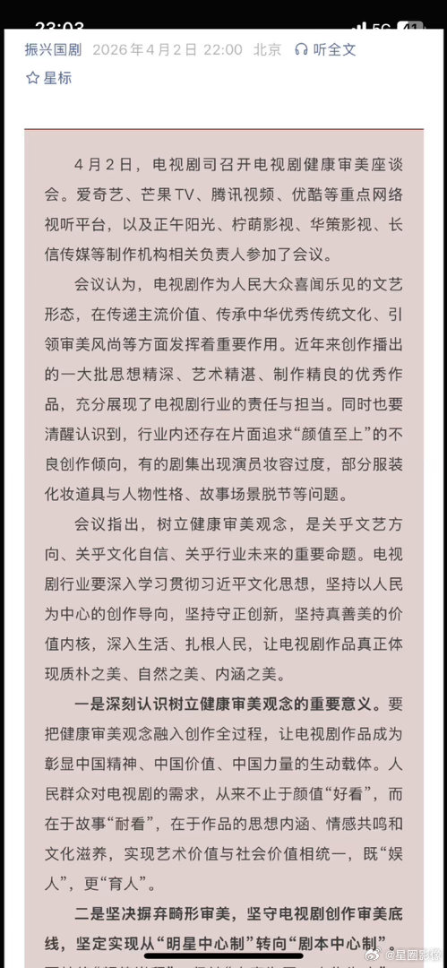 从不允许拍清宫剧开始,到现在不允许以颜值至上作为唯一标准的审美座谈会。这算是拯救长剧的一小步了。