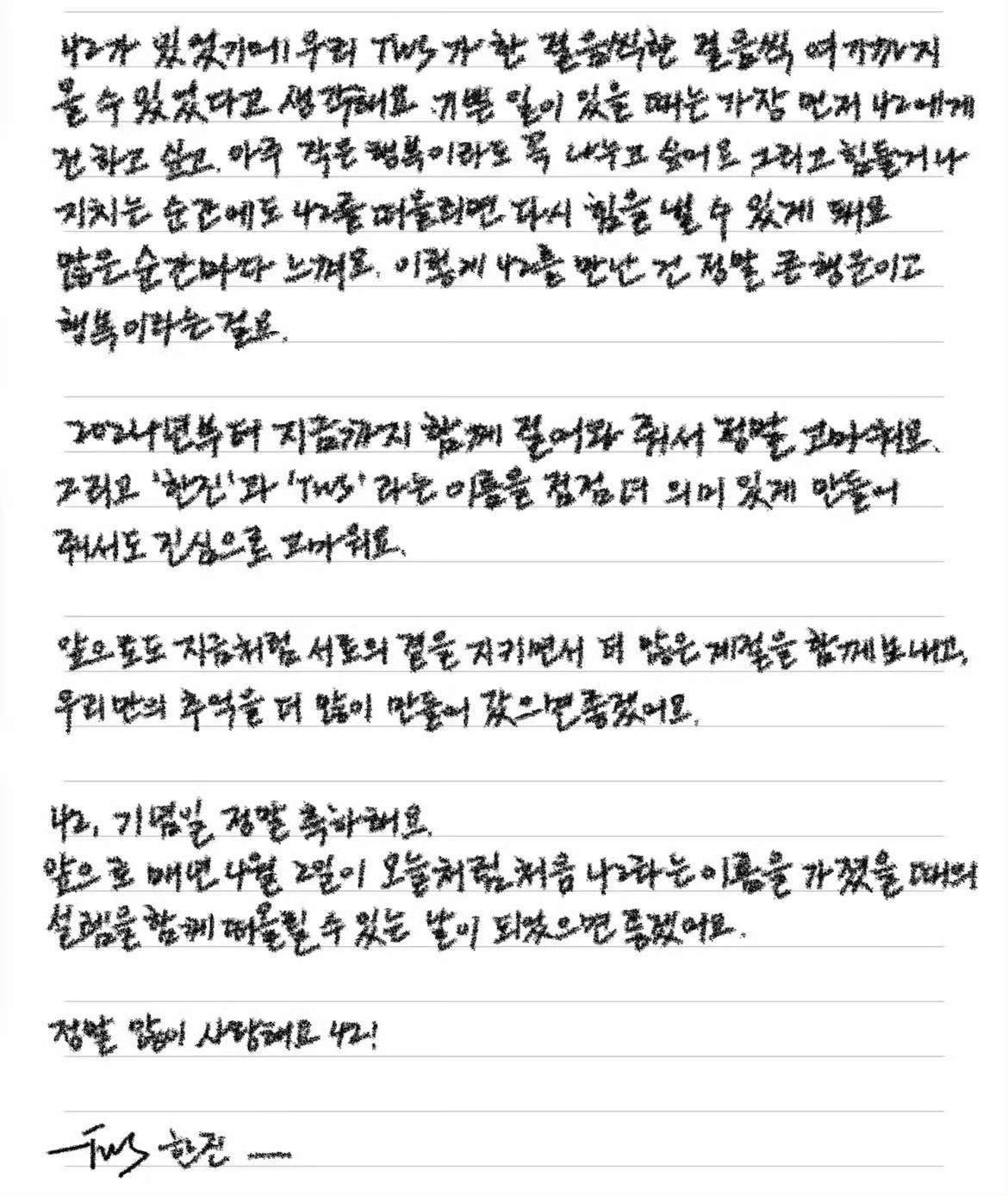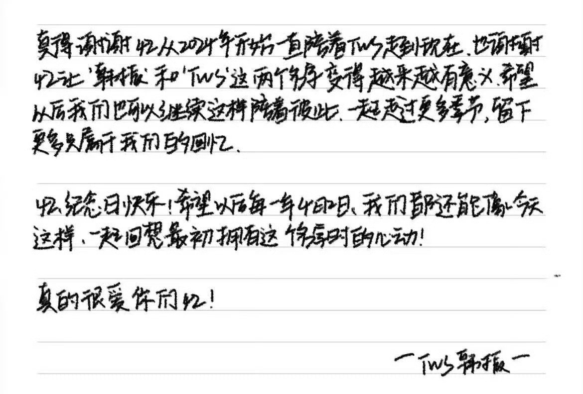 tws韩振人也太好了,今天是韩振粉丝纪念日,他特意准备了中韩双语手写信,亲笔写下