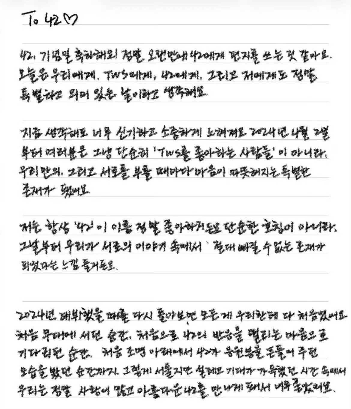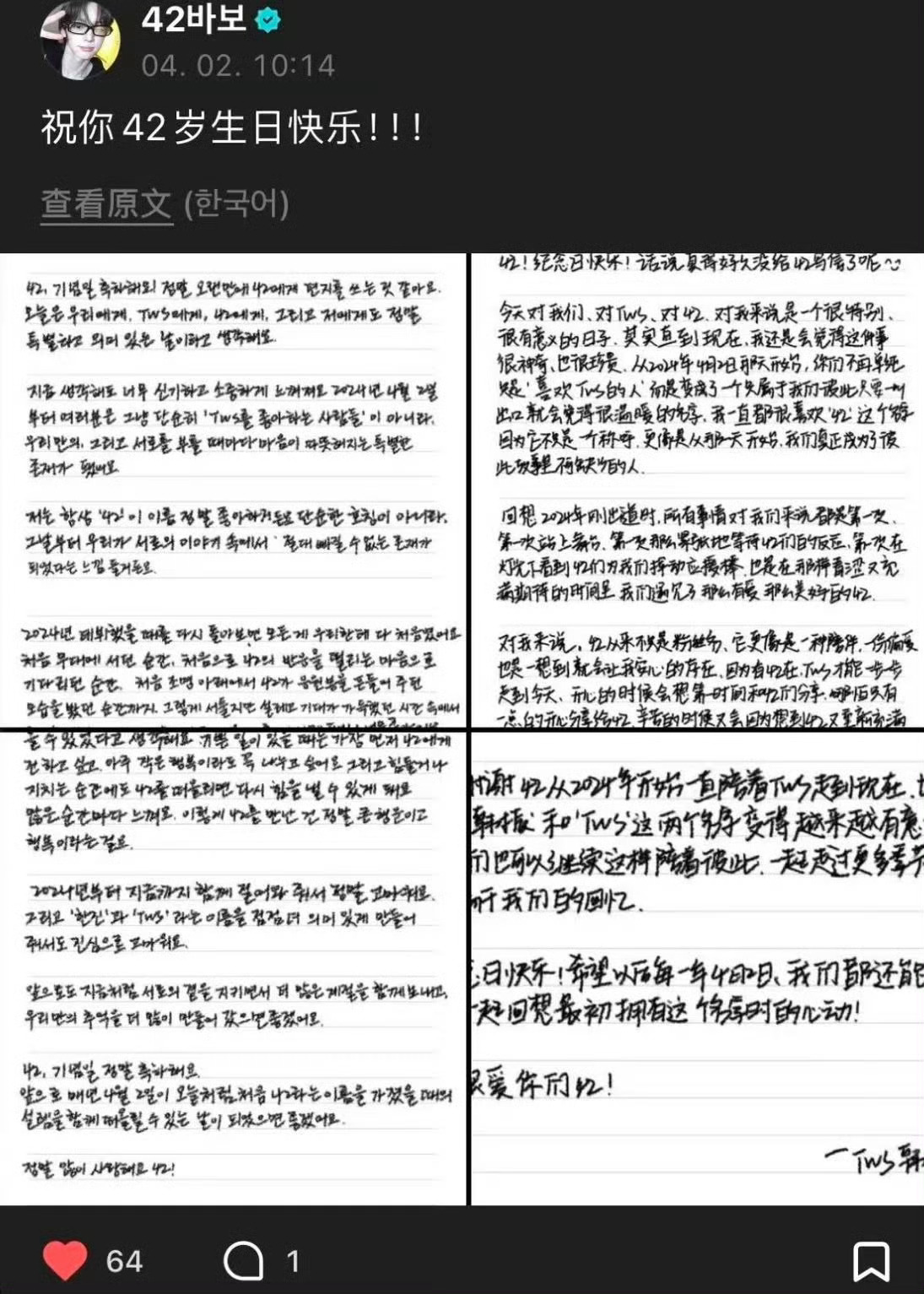tws韩振人也太好了,今天是韩振粉丝纪念日,他特意准备了中韩双语手写信,亲笔写下祝福:对我来说,42从来不只是粉丝名,它更像是一种陪伴,一份偏爱韩振手写信祝粉丝纪念日快乐