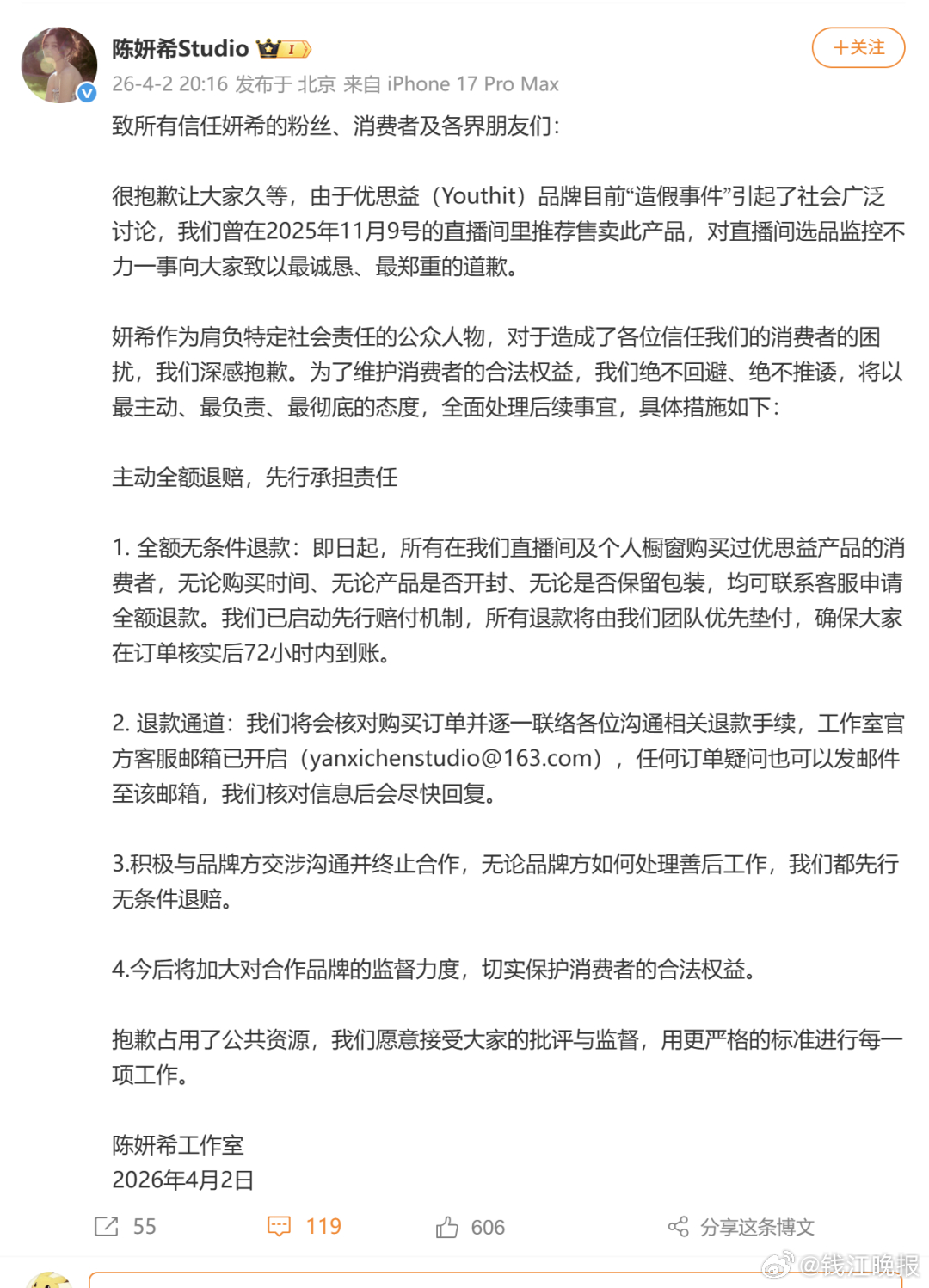 4月2日,陈妍希工作室就此事发文致歉:很抱歉让大家久等,由于优思益(Youthit)品牌目前“造假事件”引起了社会广泛讨论,我们曾在2025年11月9号的直播间里推荐售卖此产品,对直播间选品监控不力一事向大家致以最诚恳、最郑重的道歉。妍希作为肩负特定社会责任的公众人物,对于造成了各位信任我们的消费者的困扰,我们深感抱歉。为了维护消费者的合法权益,我们绝不回避、绝不推诿,将以最主动、最负责、最彻底的态度,全面处理后续事宜,具体措施如下: