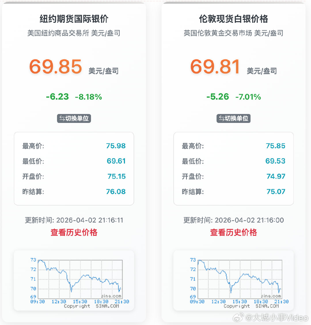 【白银大跌7%金价银价又跌麻了】4月2日,现货黄金跌3.58%,报4587.83美元/盎司;现货白银跌7.06%,报69.77美元/盎司。(财联社) 金银跳水油价飙升