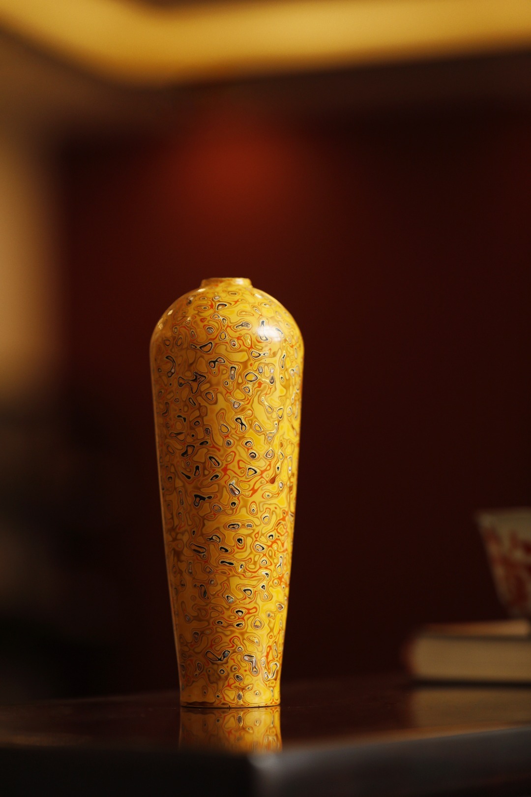 大漆 | 琥珀黄·美人肩承循传统非遗工艺,髤饰犀皮漆;入案头增色添彩,历久弥新。