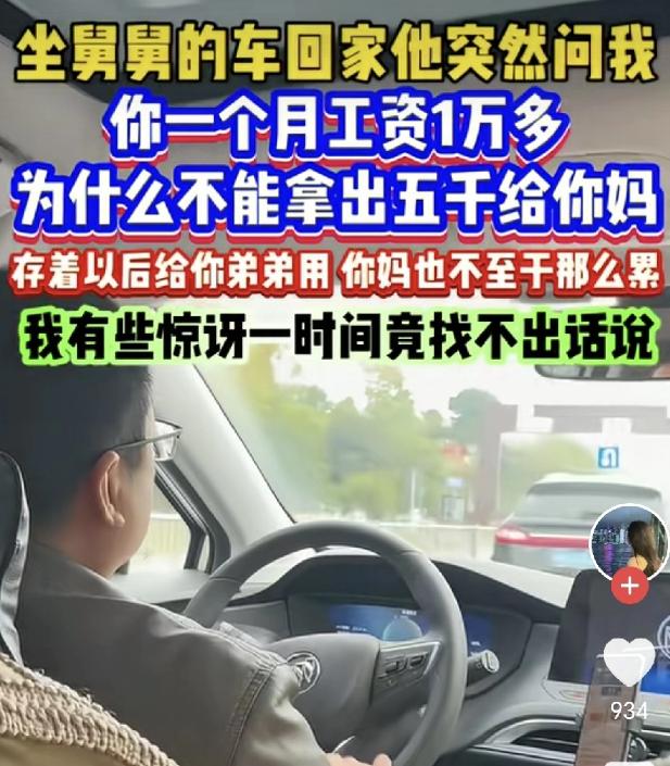 “又是一个樊胜美!”福建,一女子坐舅舅车回家,舅舅说她,你一个月工资一万多,为什么不拿出5000元给你妈?存着以后给你弟弟用,这样你妈就不用那么累了,女子惊呆,一时间不知道怎么回答,她问网友,如果弟弟3岁我可以给,如今他25岁,你们看我应该给吗? 舅舅开着车,手搭在方向盘上,偏过头来,很随意地说了一句: “你现在工资都过万了吧?每个月拿5000给你妈,让她存着,以后给你弟用。这样你妈也不用那么辛苦。” 那语气轻飘飘的,像在说晚上吃面还是吃饭。 可坐在副驾驶上的她,整个人都懵了一下。不是立刻生气,也不是马上想反驳,就是脑子里突然冒出来一句:我的工资,什么时候成家里可以随便分配的了? 月薪过万,听起来好像挺不错,像是“混出来了”。可真要算账,根本不是那么回事。 她在福建本地上班,房租、水电、吃饭、通勤,样样都要钱。平时也不是一点都不给家里,妈妈那边她本来就在贴补。剩下的钱,她一分一分攒着,是想给自己攒个首付。 她想买房,不是图什么体面,更不是虚荣。只是她心里太明白了——爸妈现在住的那个家,从来都不属于她。她是在那里长大的没错,可那个地方,从来没给过她“以后你也能回来”的底气。 那个家,默认是弟弟的。 弟弟今年25岁,好胳膊好腿,身体没毛病。 毕业之后一直没找到所谓“合适”的工作,后来干脆就不怎么找了。每天打游戏,打到昏天黑地,充值没钱了就找妈妈。偏偏妈妈对儿子又狠不下心,摆摊、打零工,自己省吃俭用,嘴里总念叨的是儿子以后怎么办、娶媳妇怎么办,却很少认真问一句:你为什么不去上班? 这个家一直都是这么个逻辑。 女儿能干,应该的;女儿懂事,应该的;女儿多出一点,也是应该的。反过来,儿子不工作,好像也能被理解;儿子躺着,似乎也总有人给他找理由。 舅舅今天不过是把这种默认规则,直接说出来了而已。 而且他说得还挺“周全”。 在他的设想里,这事简直没毛病:姐姐现在赚得多,拿一半出来,妈妈压力小了,弟弟以后也有个底,皆大欢喜。 问题是,这个“皆大欢喜”里,根本没把她算进去。 她像什么呢,像一个刚刚升值、于是被家里重新估价的资产。工资一涨,立刻就有人来盘算这笔钱该怎么分。说白了,不是亲情互助,更像一种很自然、很顺手的索取——反正你是姐姐,反正你能挣钱,反正你总不好意思拒绝。 最讽刺的是,她升职加薪这件事,本来是高高兴兴告诉妈妈的。 她那时候还挺开心,讲自己工作有多拼,加班加得多狠,也说自己想攒钱,早点买套属于自己的房子。可话一说完,她就注意到妈妈脸色有点变,只是当时没细想。 现在坐在舅舅车上,她忽然就懂了。 那不是替她高兴后的复杂,而是另一种念头已经冒出来了:女儿现在挣得多了,是不是能多承担一点了?是不是可以帮弟弟兜一把了? 舅舅,只不过是被推出来开这个口的人。 其实法律上,这种事没什么可含糊的。 《民法典》第1075条写得很清楚:兄姐对弟妹有扶养义务,是有条件的,而且对象是未成年弟妹。25岁,成年人了,身体健康,也有劳动能力,怎么都不在这个范围里。 法律能划清界限,这一点很明白。 可现实里的压力,从来不只是法律问题。饭桌上的沉默,长辈一句“你是姐姐”,妈妈那种又累又委屈的眼神,这些东西,不会因为法条写得清楚就自动消失。 她最后没跟舅舅吵,也没当场答应。 只是安安静静坐着,看着车窗外一路往后退的景色,心里一点点发沉。她想到自己租的那间小房子,想到那张不算舒服但完全属于自己的床,甚至想到假期结束以后,哪儿也不想去,就想一个人躺着,睡到天昏地暗。 那个“天昏地暗”,说白了,不只是累,是想躲。躲开这些默认她该付出的关系,躲开那个她怎么努力都很难被平等对待的家。 同样是25岁。 弟弟打游戏,充值要妈妈掏钱;她租房、上班、存首付,连生活里那些细碎小事都全靠自己。明明是同一对父母的孩子,活法却像完全不是一个频道上的。 可现在,家里有人想把这两条本来就不公平的线,硬生生拧到一起。让她继续往前跑,然后把跑出来的钱,拿去垫那个根本不想站起来的人。 还说得很体面:这是为了减轻妈妈负担。 可妈妈的负担,到底是怎么来的,真的没人知道吗? 她攒首付的那些钱,不是什么轻飘飘的“余额”。 是一顿外卖不舍得点,省下来的;是周末加班后忍着疲惫,告诉自己再攒一点的结果;是一件衣服没买、一次出门没去、很多个“算了,先别花”的积累。 那不是冷冰冰的数字。那是她给自己留的一条后路。