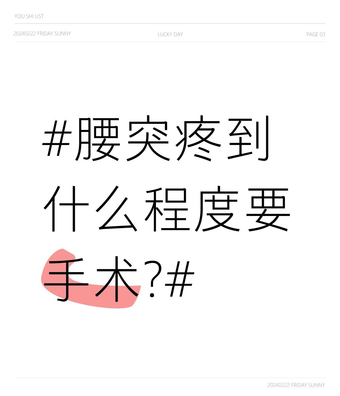 腰突疼到什么程度要手术? 腰突疼到啥程度要手术,这得看具体情况。一般来说,要是保守治疗不管用,像经过3 - 6个月卧床休息、物理治疗、药物治疗等,腰腿痛、腿麻症状还没缓解,且反复发作,严重影响生活工作,就该考虑手术了。 要是出现神经根麻痹、马尾神经压迫,比如感觉减退、肌肉无力、大小便功能障碍,就得尽早手术,马尾神经综合征更是要在24 - 48小时内完成椎管减压术。另外,要是MRI或CT显示椎间盘突出巨大,和症状高度吻合,或者有神经嵌压,保守治疗搞不定,也得手术。总之,治疗方案得听医生的。