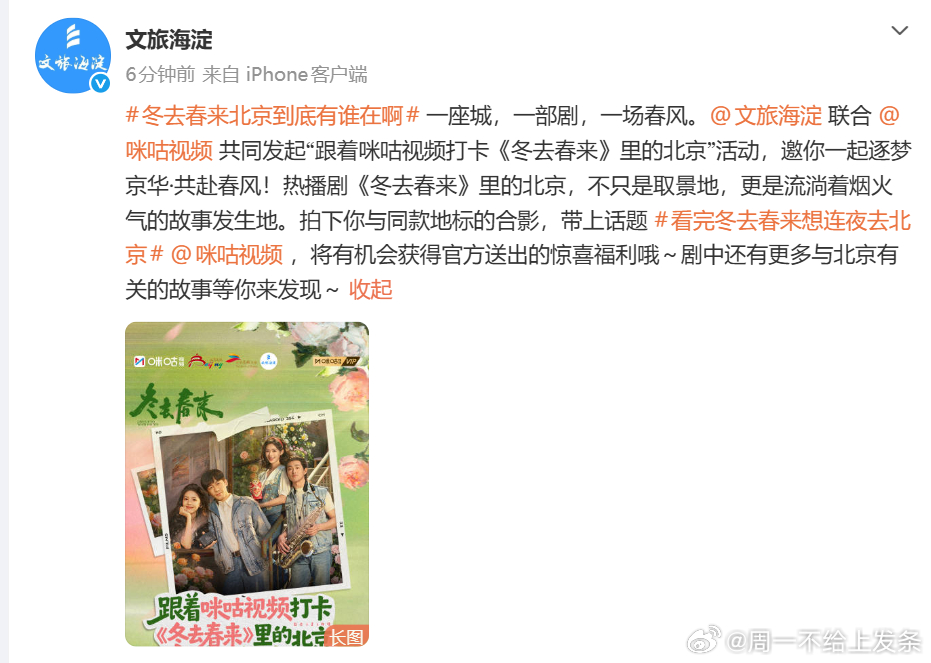 冬去春来北京到底有谁在啊看完冬去春来想连夜去北京 角楼的安静、北京站的人来人往、锣鼓胡同的烟火气、中央电视塔的灯火……以前在屏幕上看到这些地方,觉得就是普通景点。现在跟着咪咕视频和北京文旅的打卡活动,突然觉得每一处都有故事。让影视照进城市,让追剧变成行走,这个活动真的很有意义。
