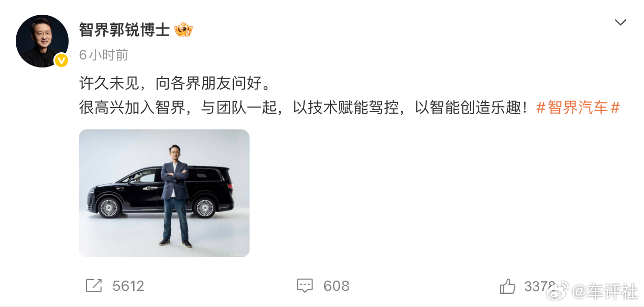 汽车人事变动 【又一华为大佬加入!智界迎来掌门人】4月2日,郭锐发布首条微博官宣加入鸿蒙智行智界汽车,目前该微博认证信息显示,郭锐出任智界汽车董事长兼首席执行官。郭锐在微博中表示:“许久未见,向各界朋友问好。很高兴加入智界,与团队一起,以技术赋能驾控,以智能创造乐趣”。车评观察