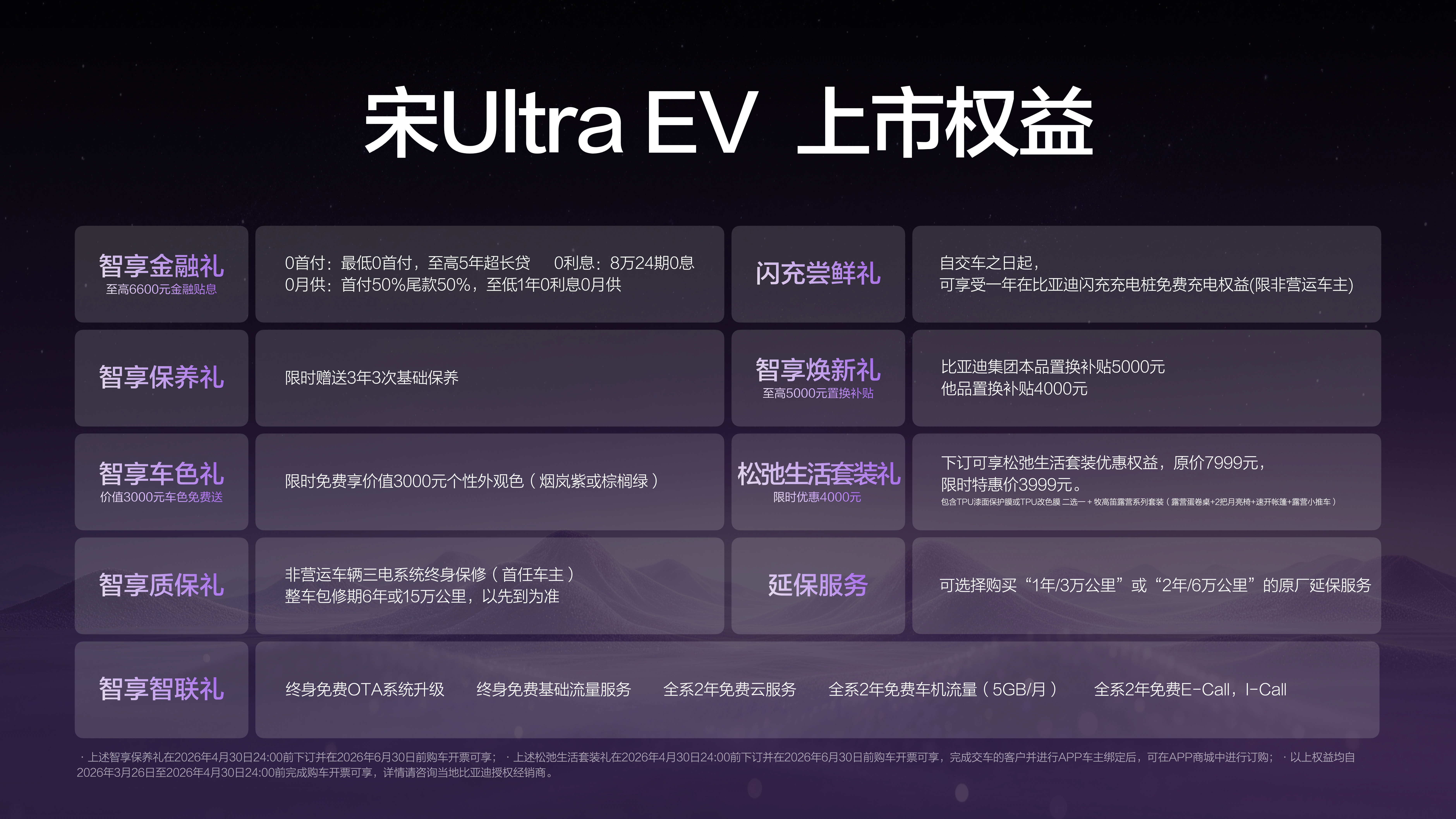 比亚迪宋 Ultra EV 重磅上市,售价 15.19 万 - 17.99 万元,颠覆技术打造越级体验,开启 B 级纯电 SUV 闪充新时代。新车全系搭载第二代刀片电池与闪充技术,9 分钟可从 10% 充至 97%,最高续航 710 公里。标配云辇 - C、TBC 爆胎稳行系统,77% 超高强度钢车身搭配 7 气囊,安全可靠。2840mm 大轴距空间宽敞,百公里加速 6.8 秒,全系超百项配置,更享 “0 元购、0 元用、0 元养” 权益,家用纯电 SUV 首选。
