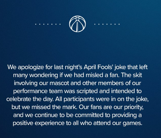 虎扑04月02日讯奇才官方就愚人节当晚的玩笑发布声明:
